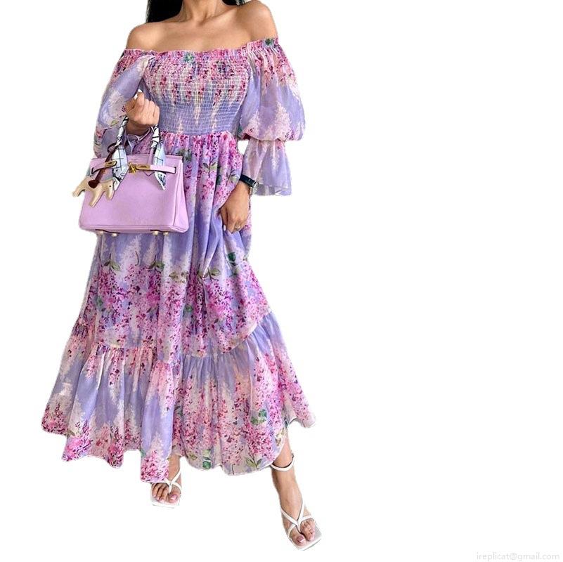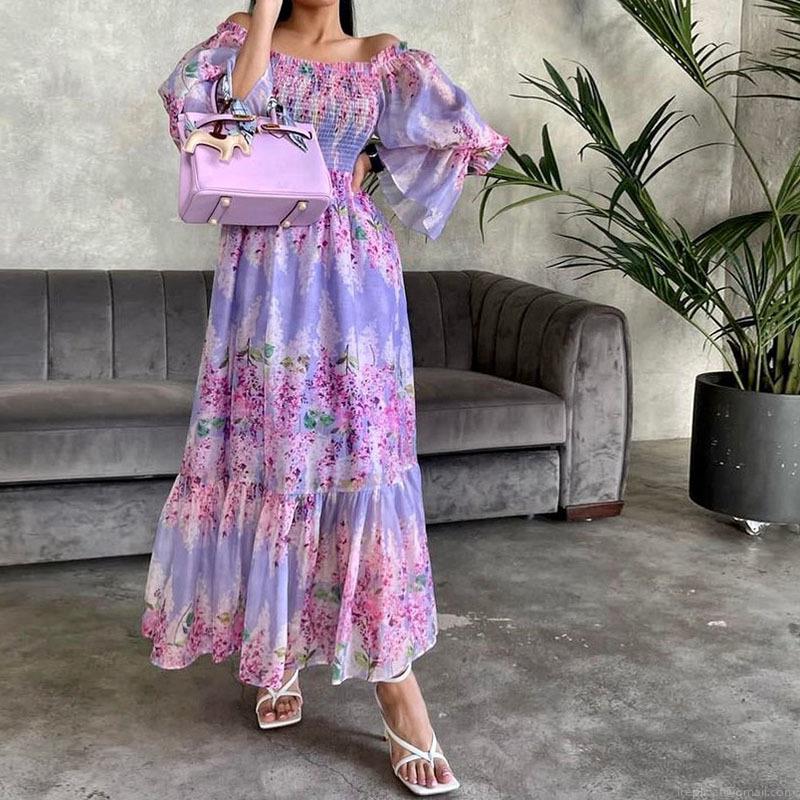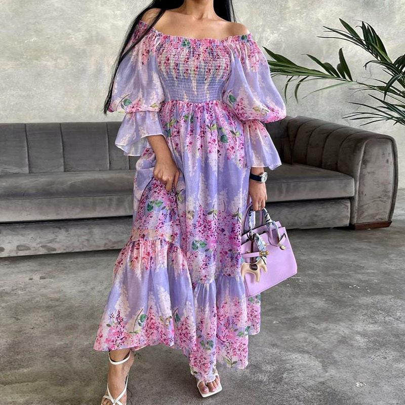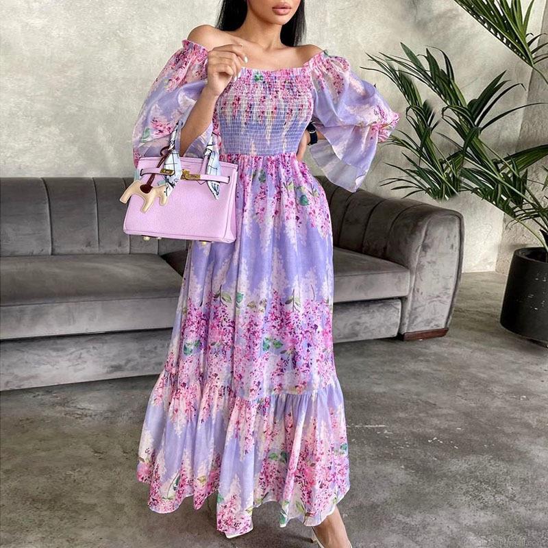 • Elegant Floral Off-The-Shoulder Maxi Dress Women Long Sleeve Ruched Splicing Big Swing Polyester Long Dresses For Daily Dating Party