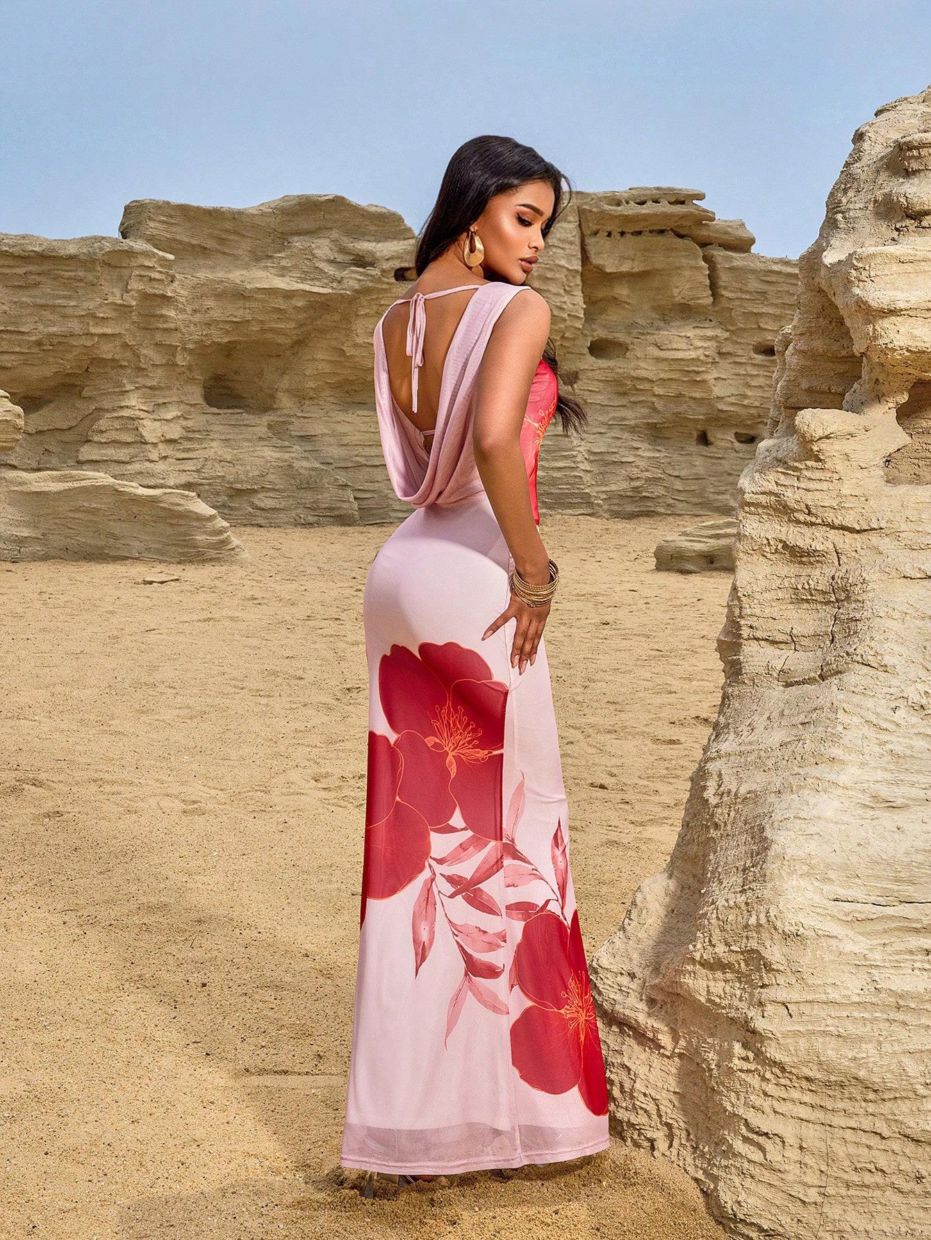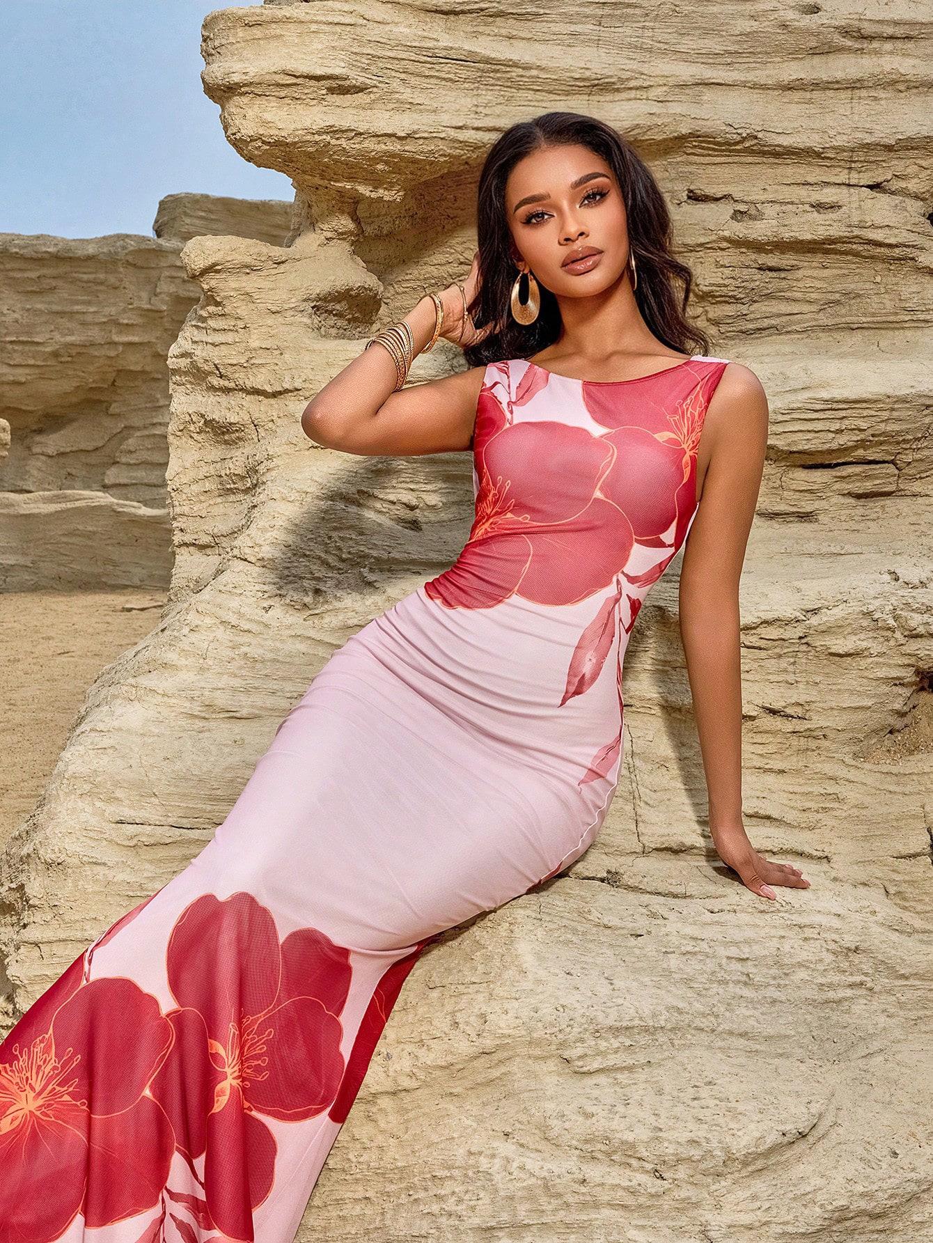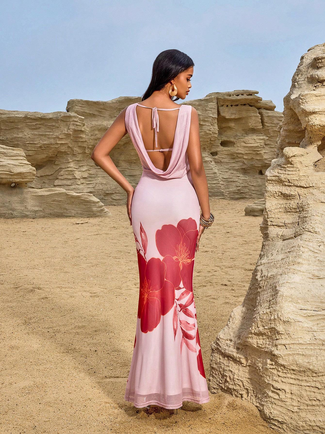 • Elegant Floral Print Backless Halter Maxi Dress For Women Summer Vacation Party Slim Fit High Waist Sleeveless Mesh Polyester Spandex Long Dress