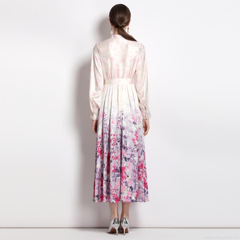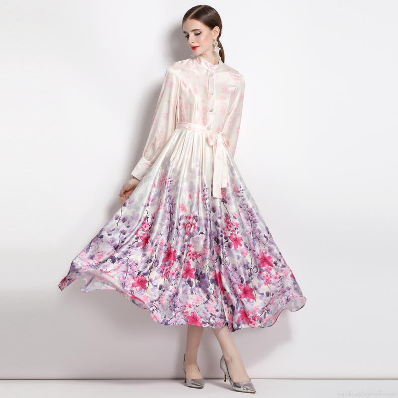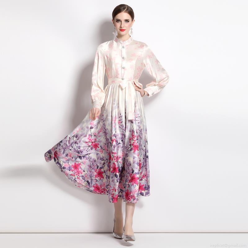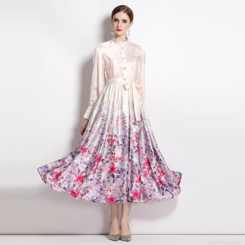 Elegant Floral Print Maxi Dress Satin Stand Collar Lantern Sleeve Button Front A-Line Party Dress For Women Vintage Style With Waist Belt