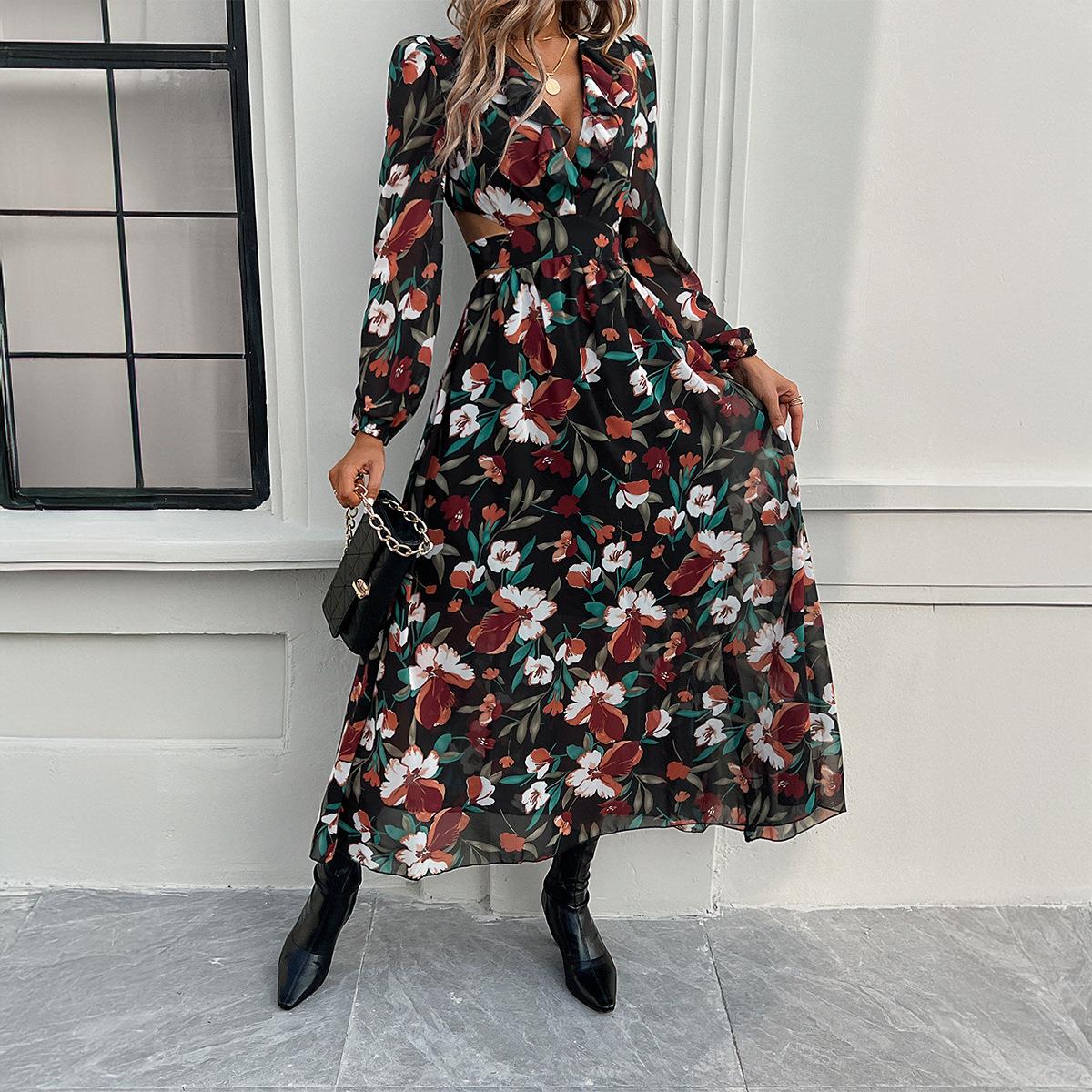 • Elegant Floral Print V-Neck Maxi Dress Long Sleeve Hollow Out Waist Ruffle Chiffon Long Dress For Women Summer Vacation Beach Boho Party
