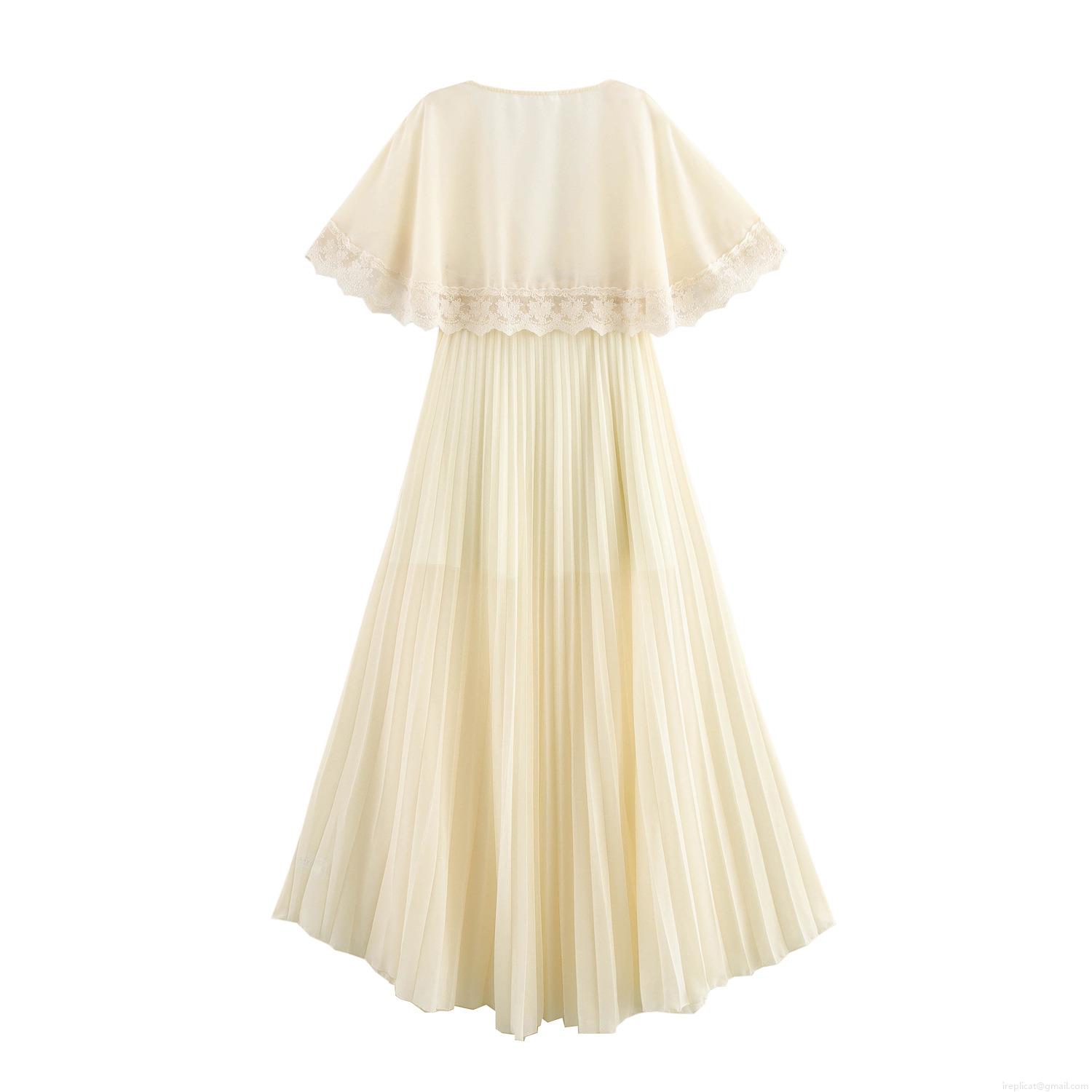 • Elegant French Romantic Lace V Neck Maxi Dress With Cape Sleeve Pleated Hem Polyester Chiffon Long Dress For Women Wedding Party Vacation