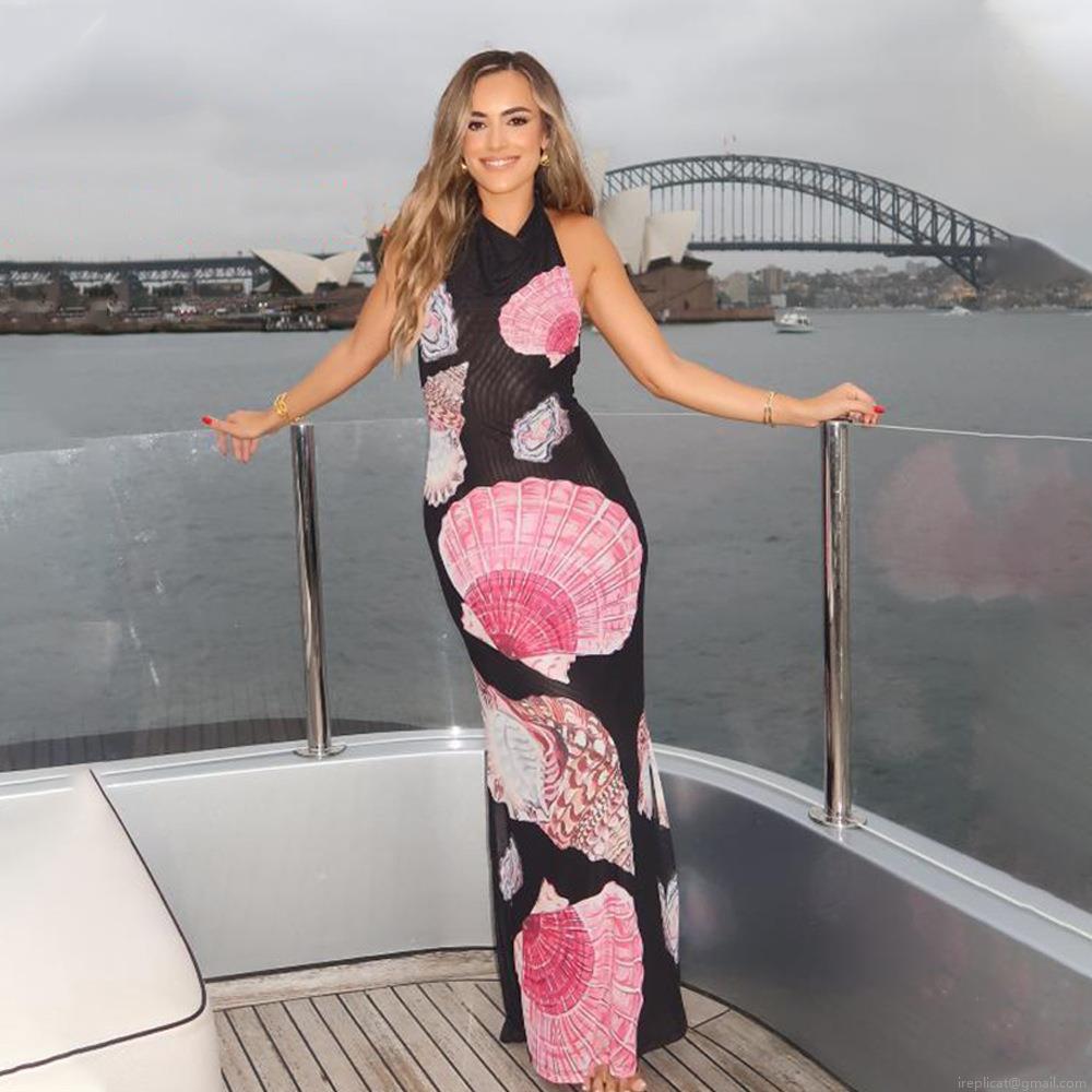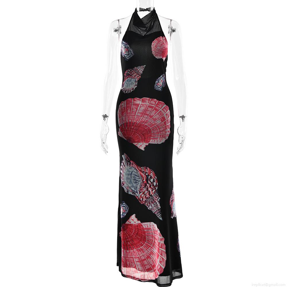 Elegant French Sexy Halter Maxi Dress Women Backless Slim Fit Seashell Print Polyester Mesh Milk Silk Long Dress For Beach Vacation Party Summer