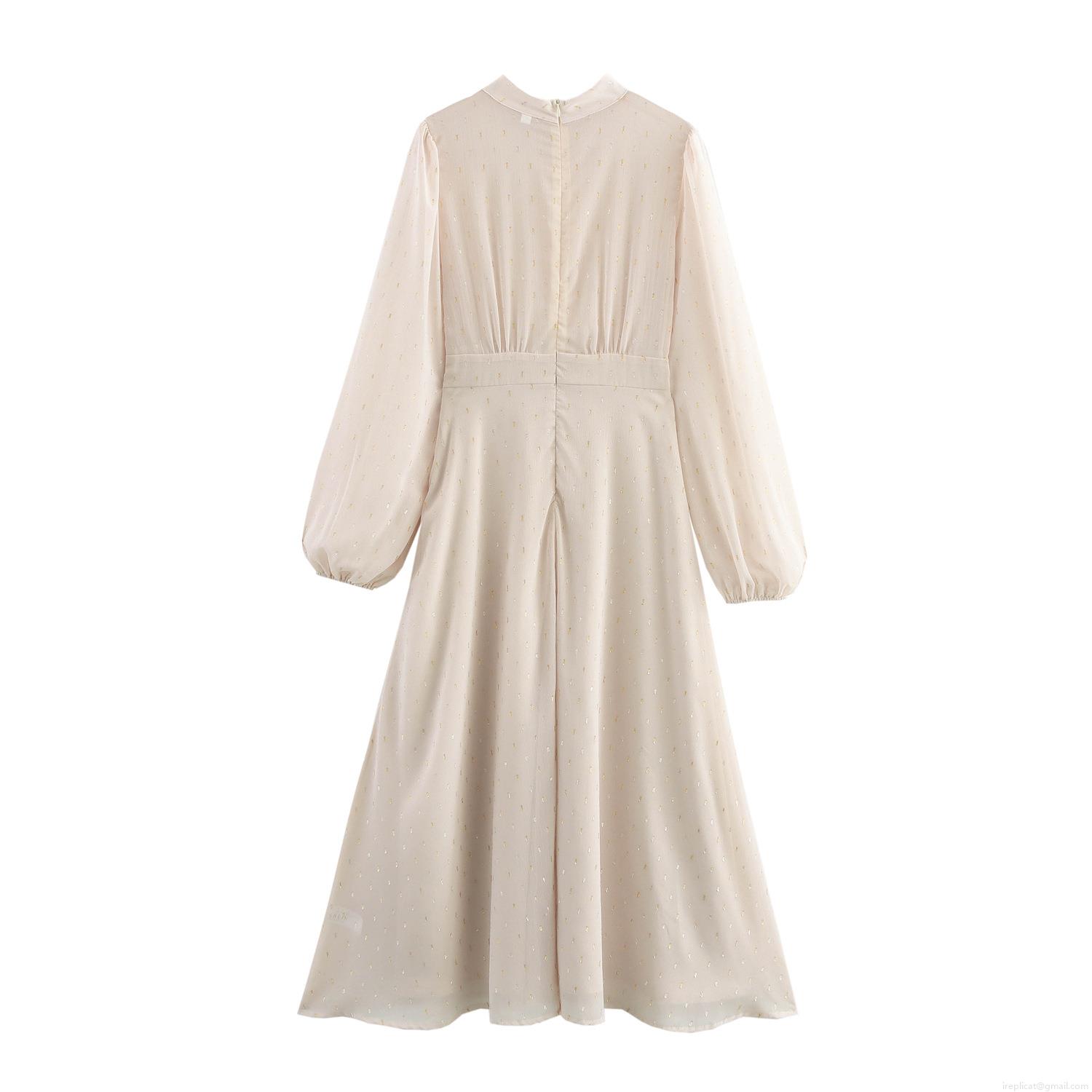 • Elegant French Style Maxi Dress Chiffon Polyester With Gold Metallic Polka Dot Pleated Long Sleeve Lantern Sleeve High Waist Long Dress For Women Party Wedding Guest