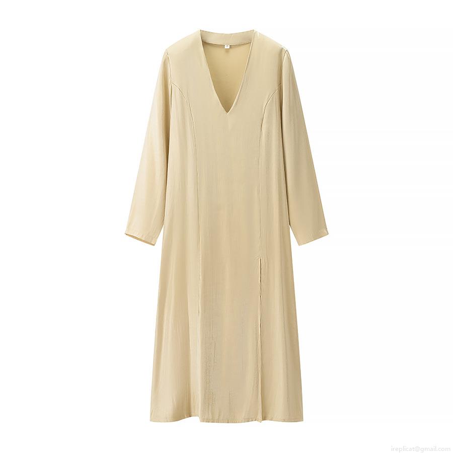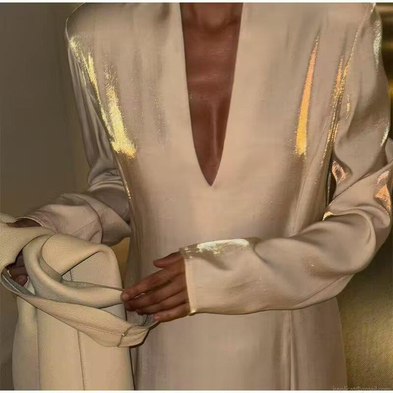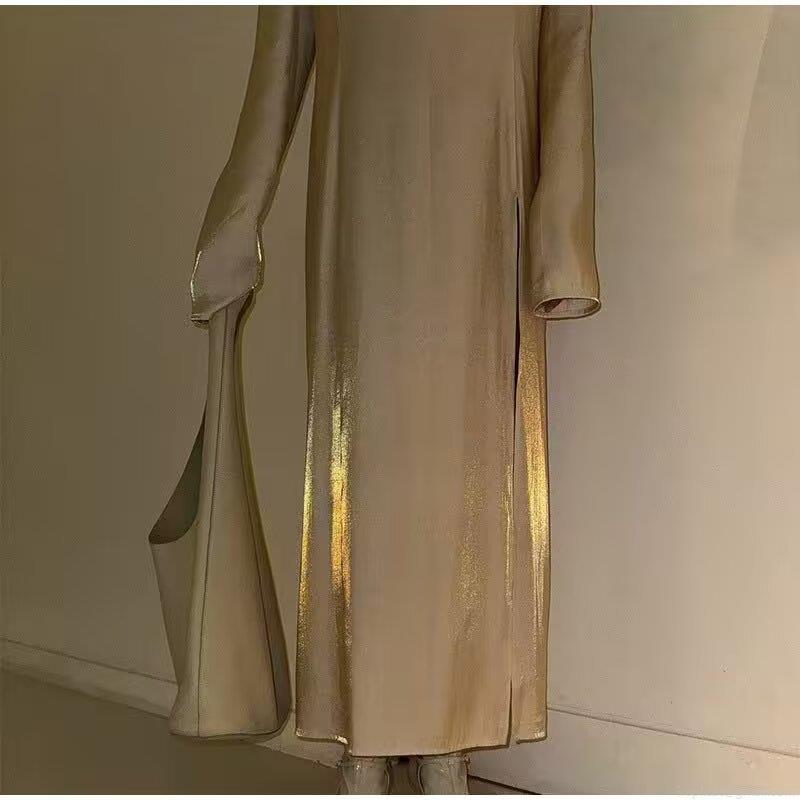 • Elegant French Style Satin V-Neck Long Sleeve Maxi Dress With Side Slit Champagne Gold A-Line Loose Long Skirt For Women Wedding Party Evening Banquet Autumn Fashion