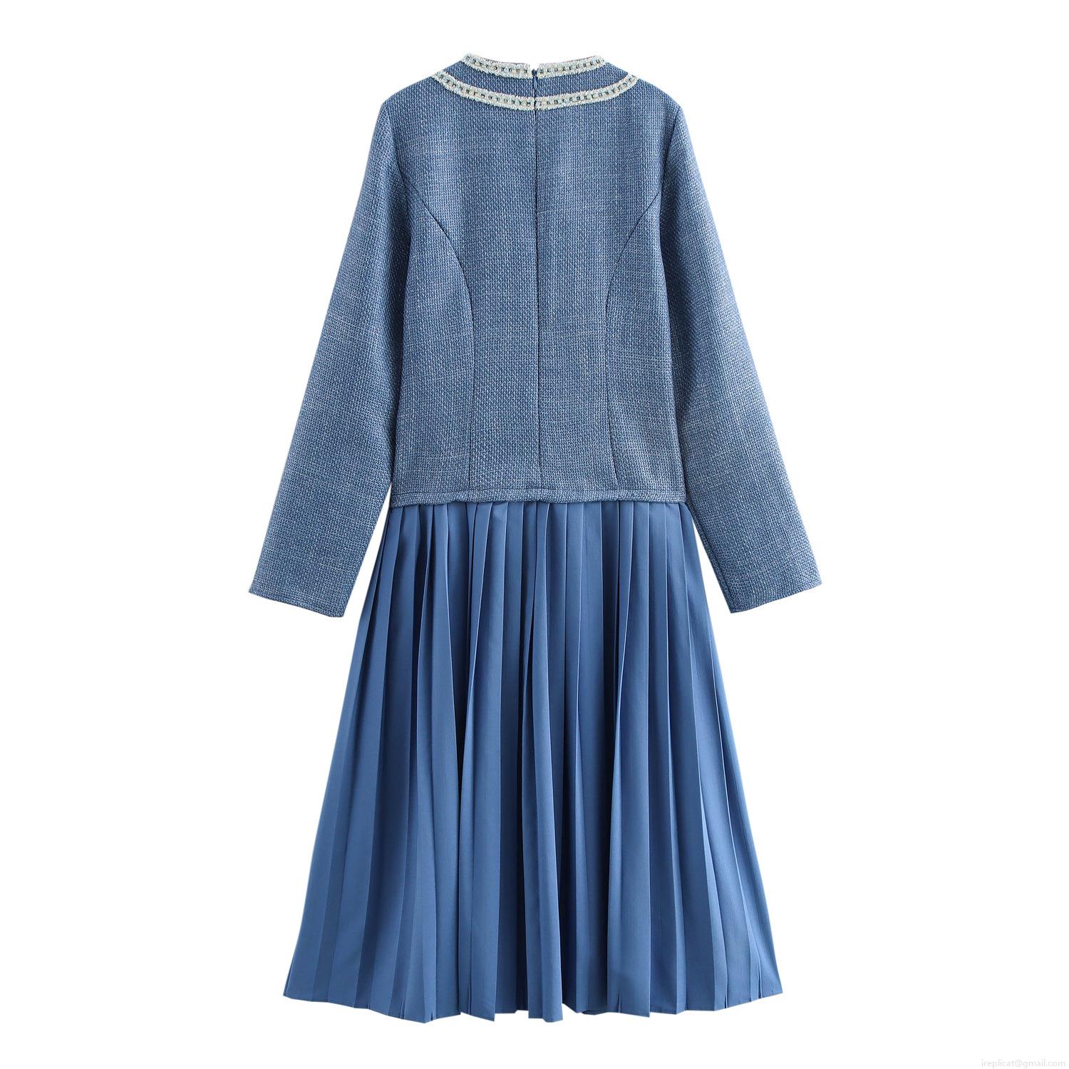 • Elegant French Style Tweed Pleated Maxi Dress Long Sleeve Round Neck Fake Two-Piece Design With Gold Buttons And Fringe Trim Polyester Gown For Women Party Event