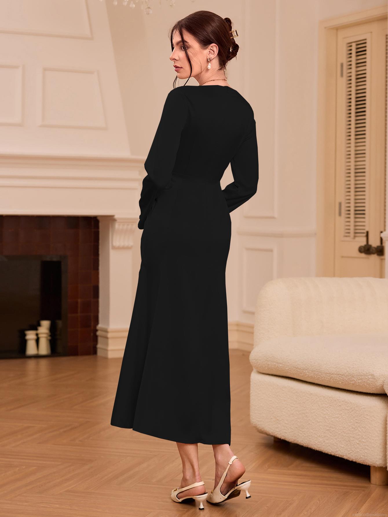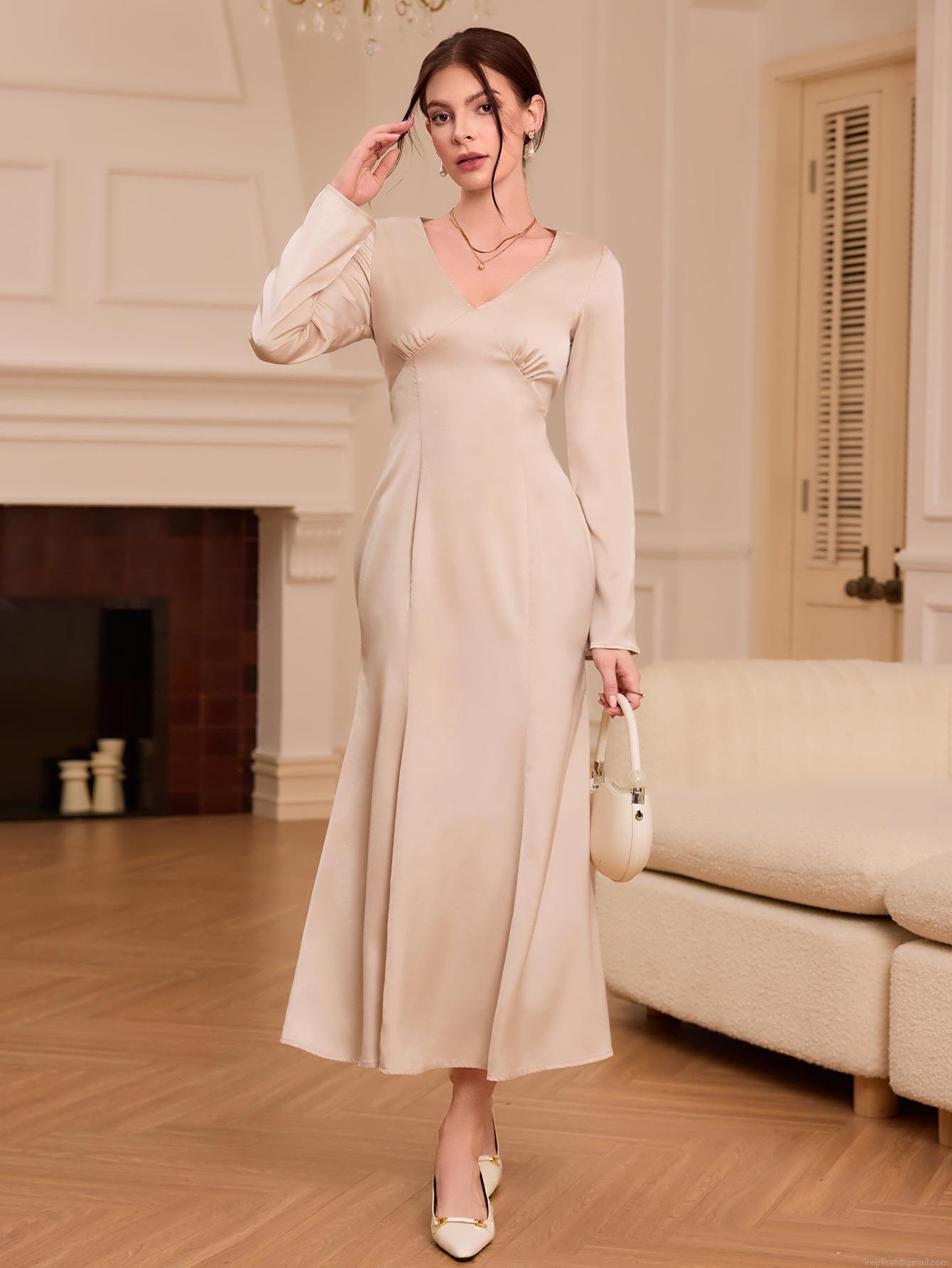 • Elegant French Style V-neck Satin Maxi Dress For Women 100% Polyester Slim Fit Long Sleeve Ruched Evening Party Dress
