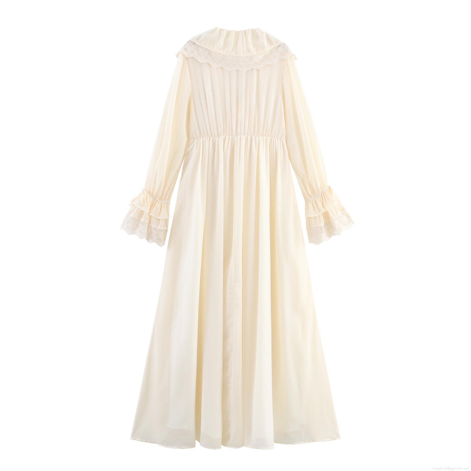 Elegant French Vintage Women's V-Neck Ruffle Maxi Dress Creamy White Chiffon Lace Flare Sleeve Long Sleeve Pullover Pure Desire Style Party Evening Long Dress