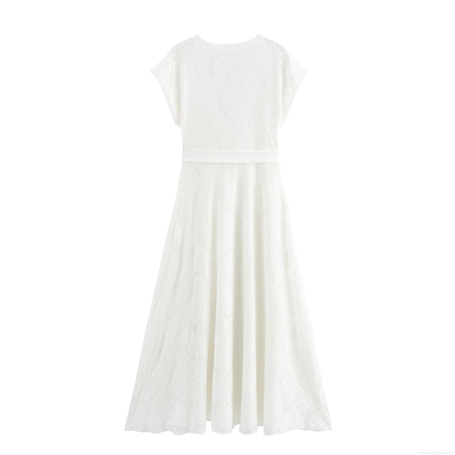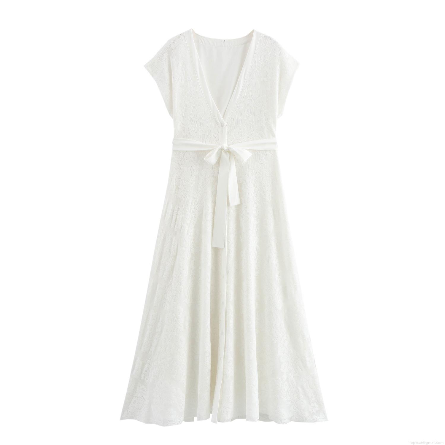 • Elegant French V-Neck Short Sleeve Floral Lace-up Waist Maxi Dress For Women Wedding Party Evening Summer Dress White Jacquard Lace Long Gown