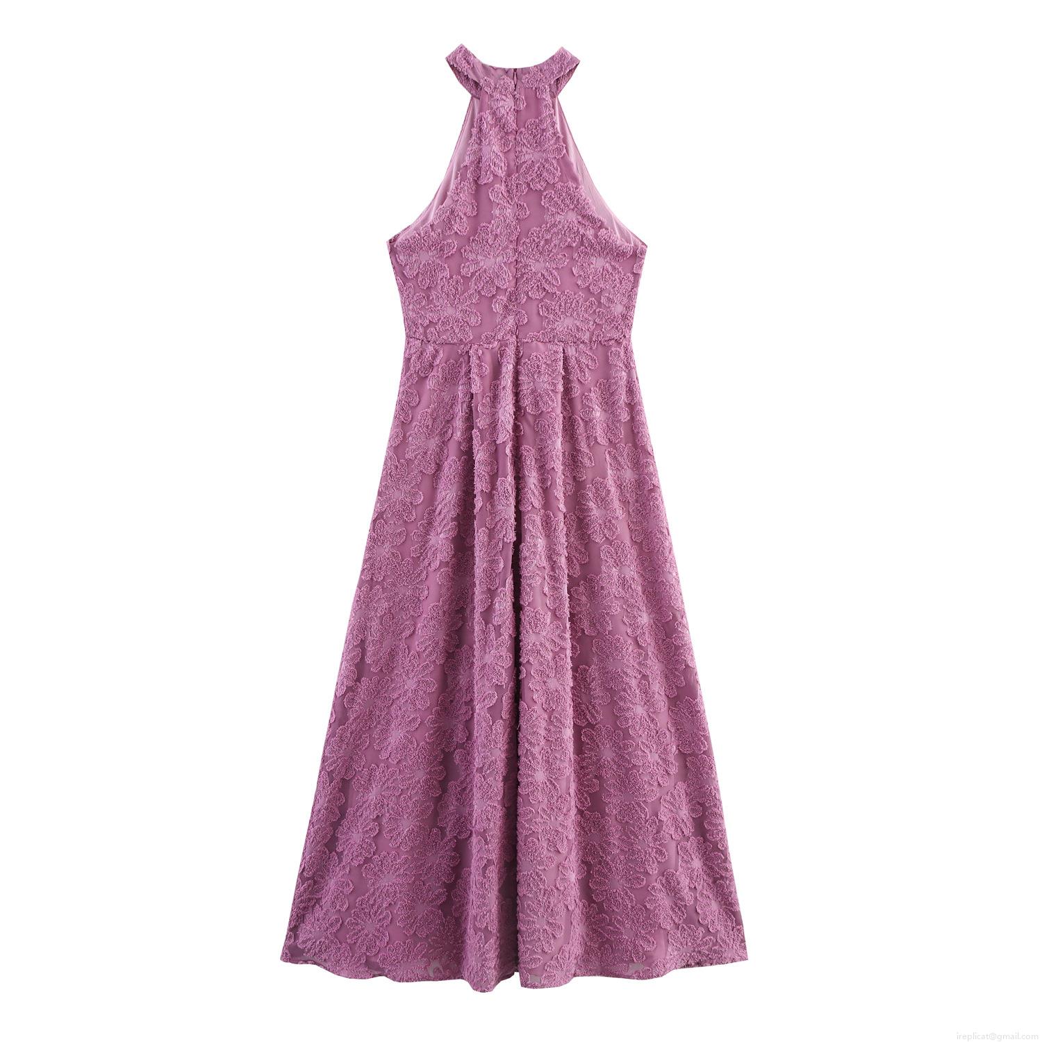 Elegant Fuchsia Halter Neck Maxi Dress For Women Sexy Sleeveless Jacquard Floral Textured Backless Party Evening Wedding Long Dress