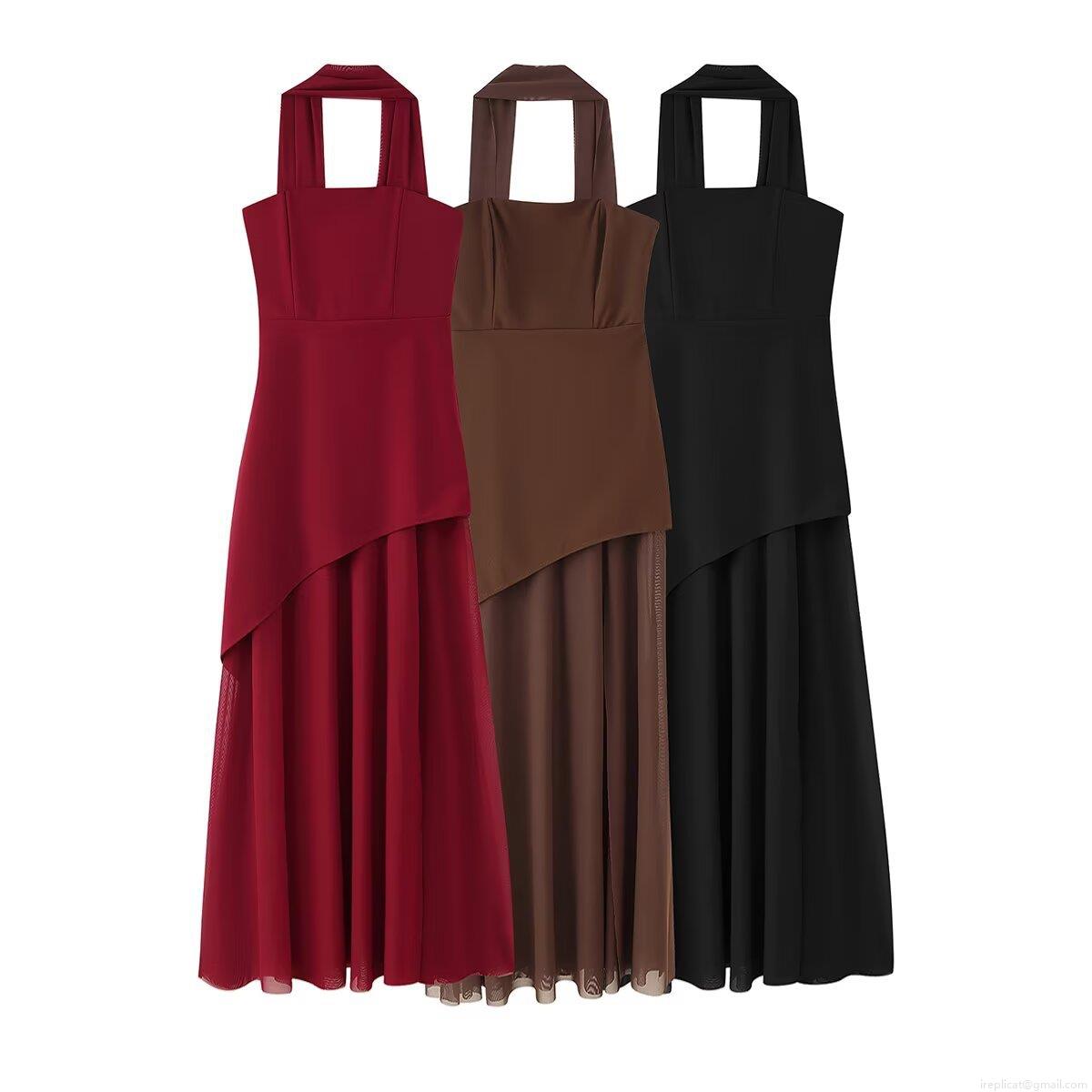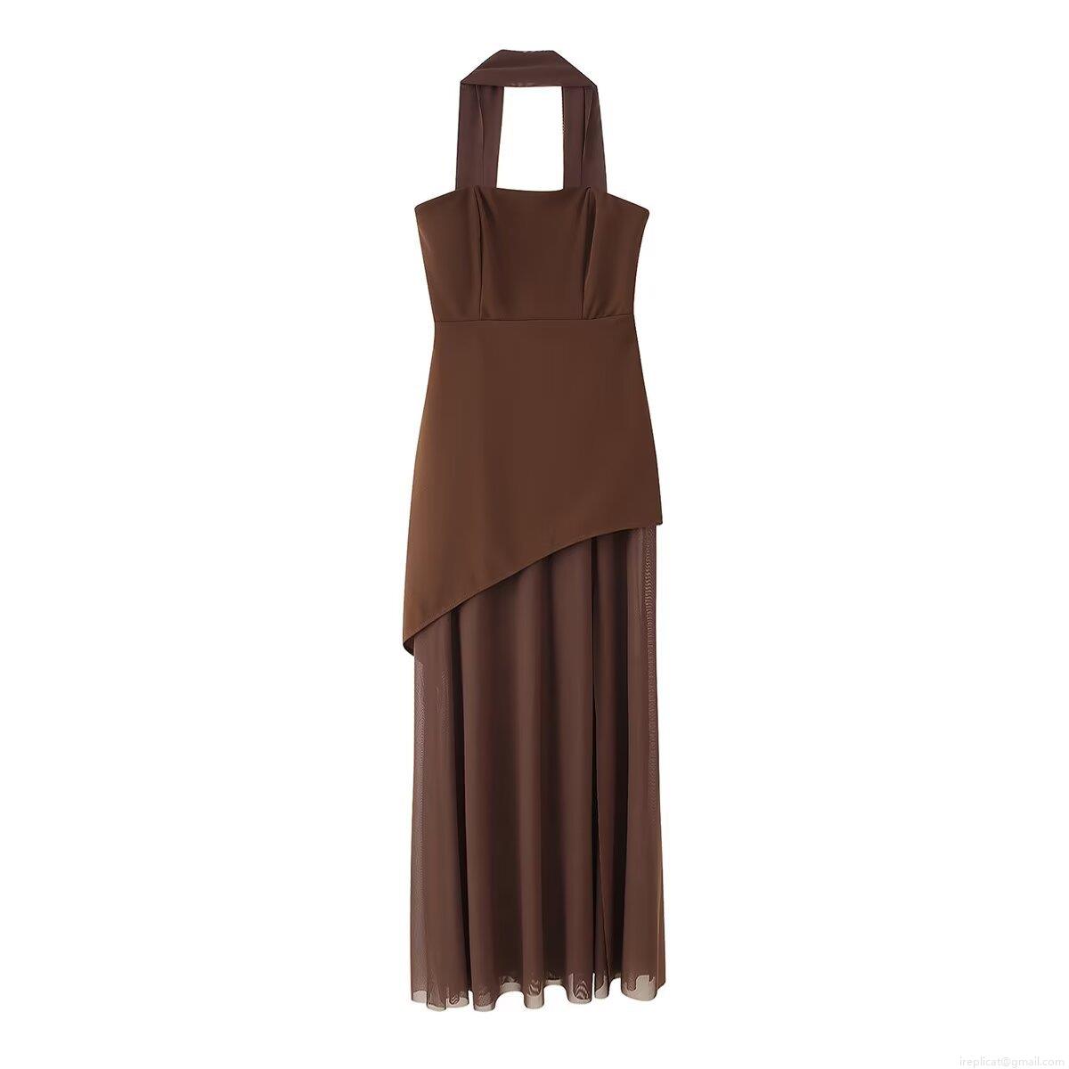 • Elegant Halter Neck Maxi Dress For Women Sexy V-Neck Asymmetric Layered Hem Backless Slim Fit Polyester Long Party Dress For Evening Vacation