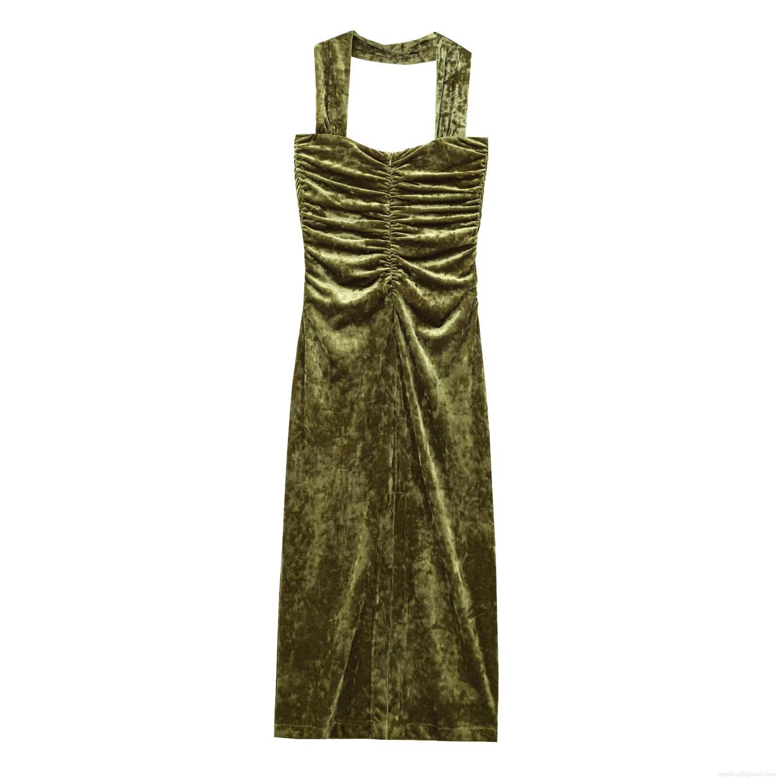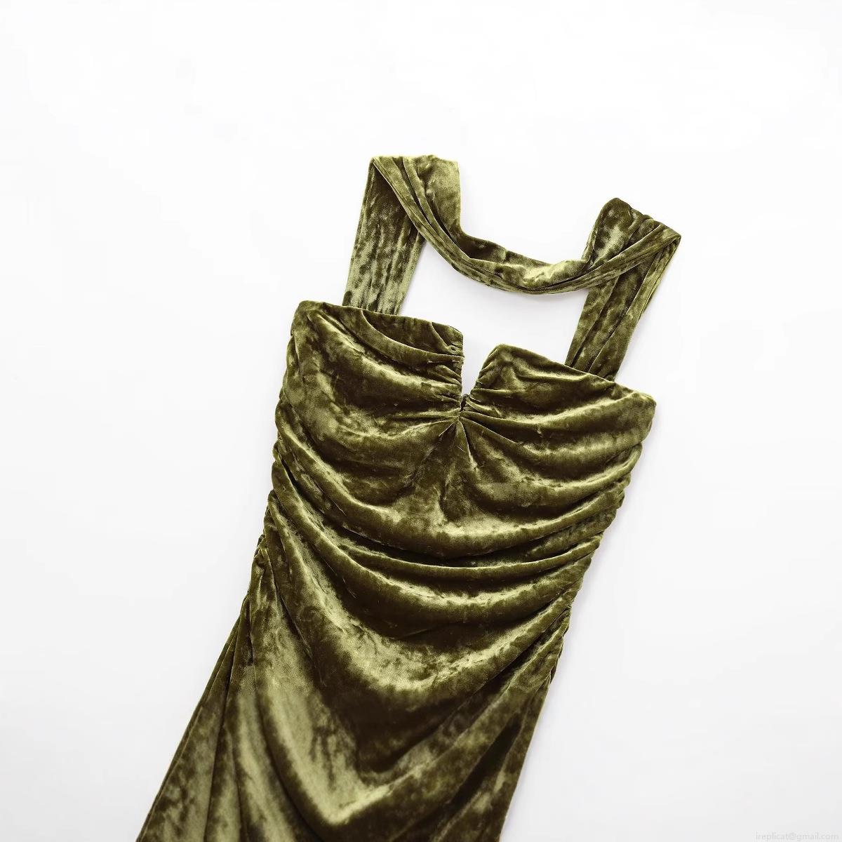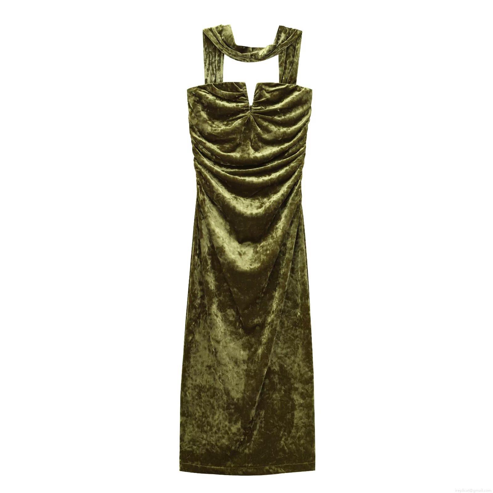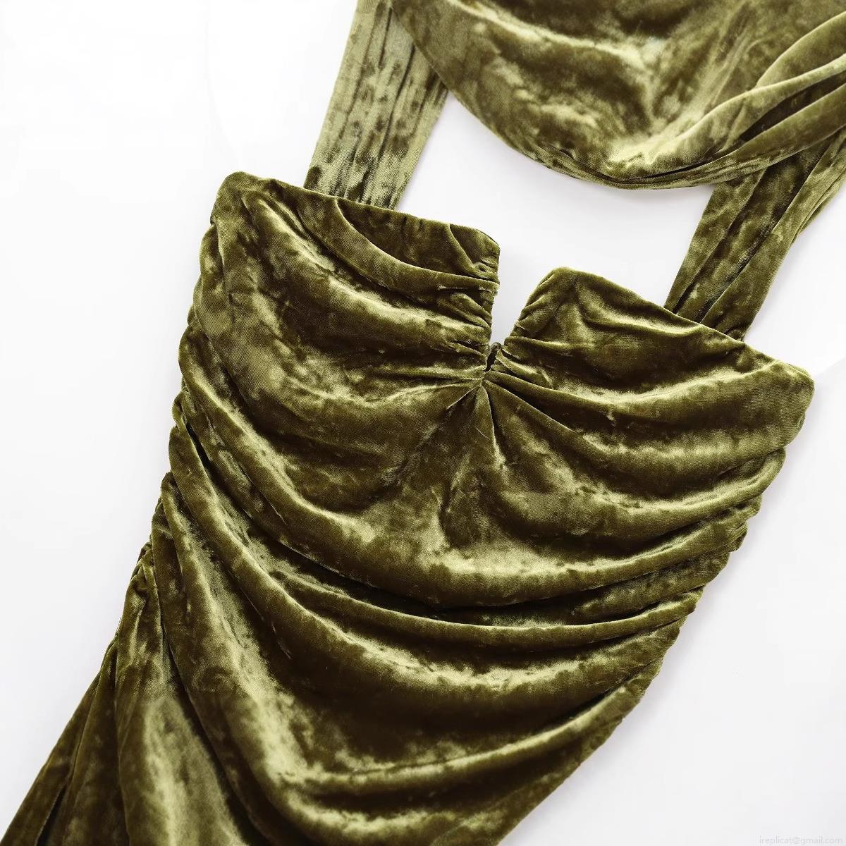 • Elegant Halter V-Neck Ruched Velvet Maxi Dress For Women Slim Fit Moss Green Evening Party Bodycon Long Dress Solid Color Autumn Winter Dress