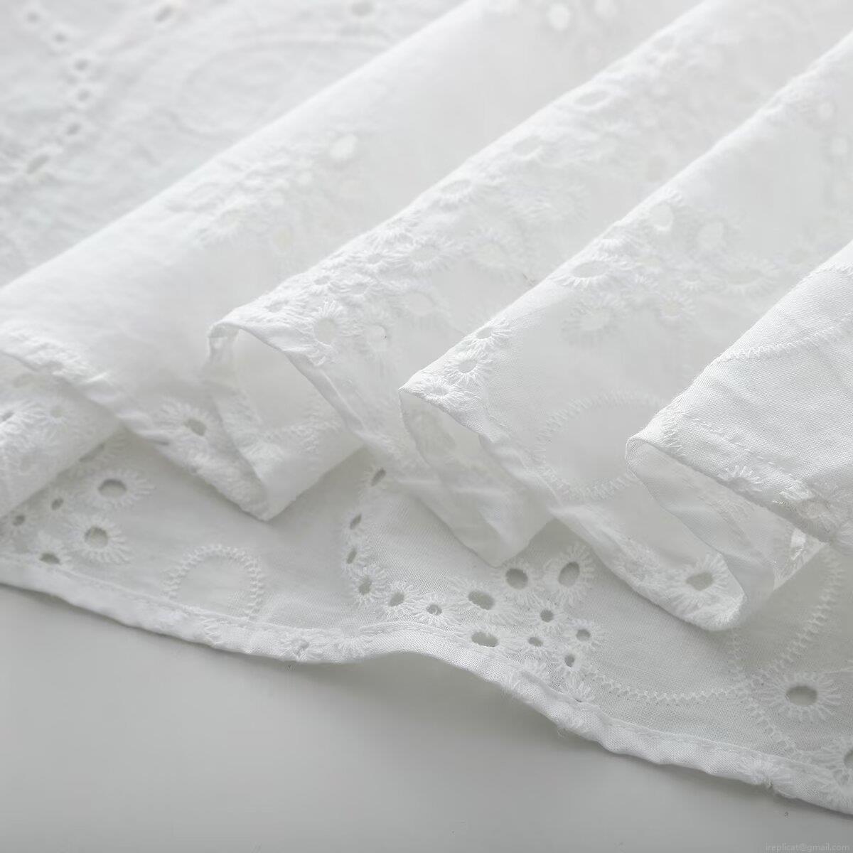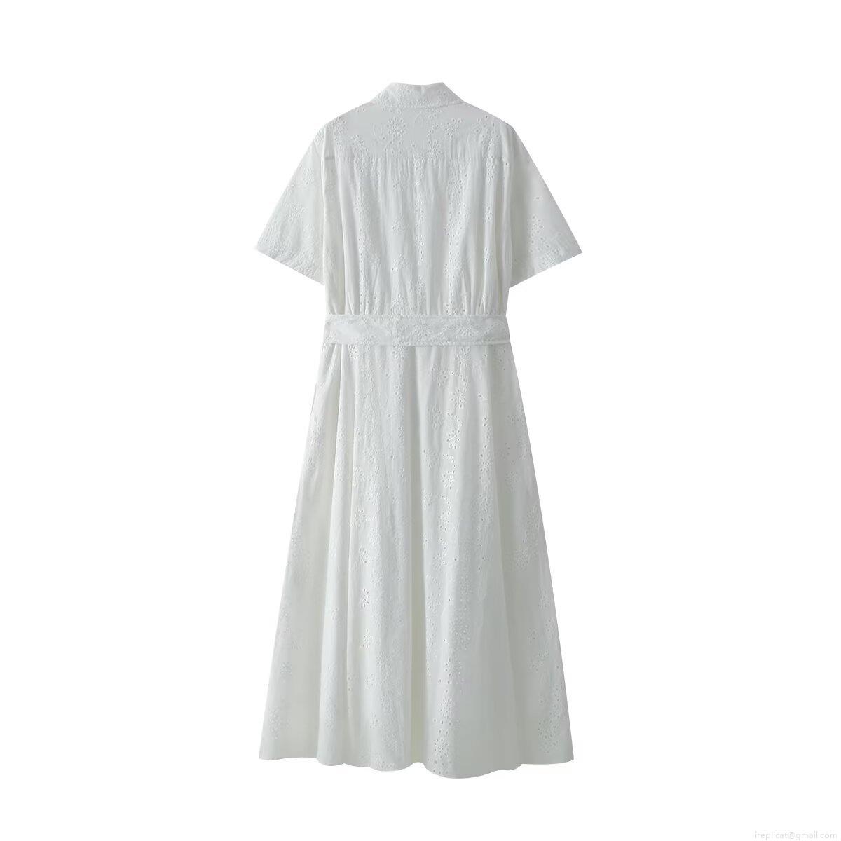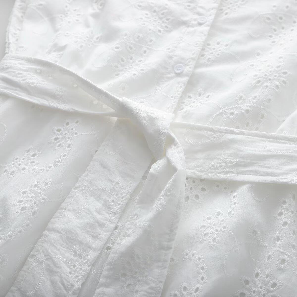 • Elegant Hollow Out Embroidery Cotton Blend Shirt Dress For Women Short Sleeve Lapel Button Down Belted A-Line Maxi Dress For Summer Daily Commuting