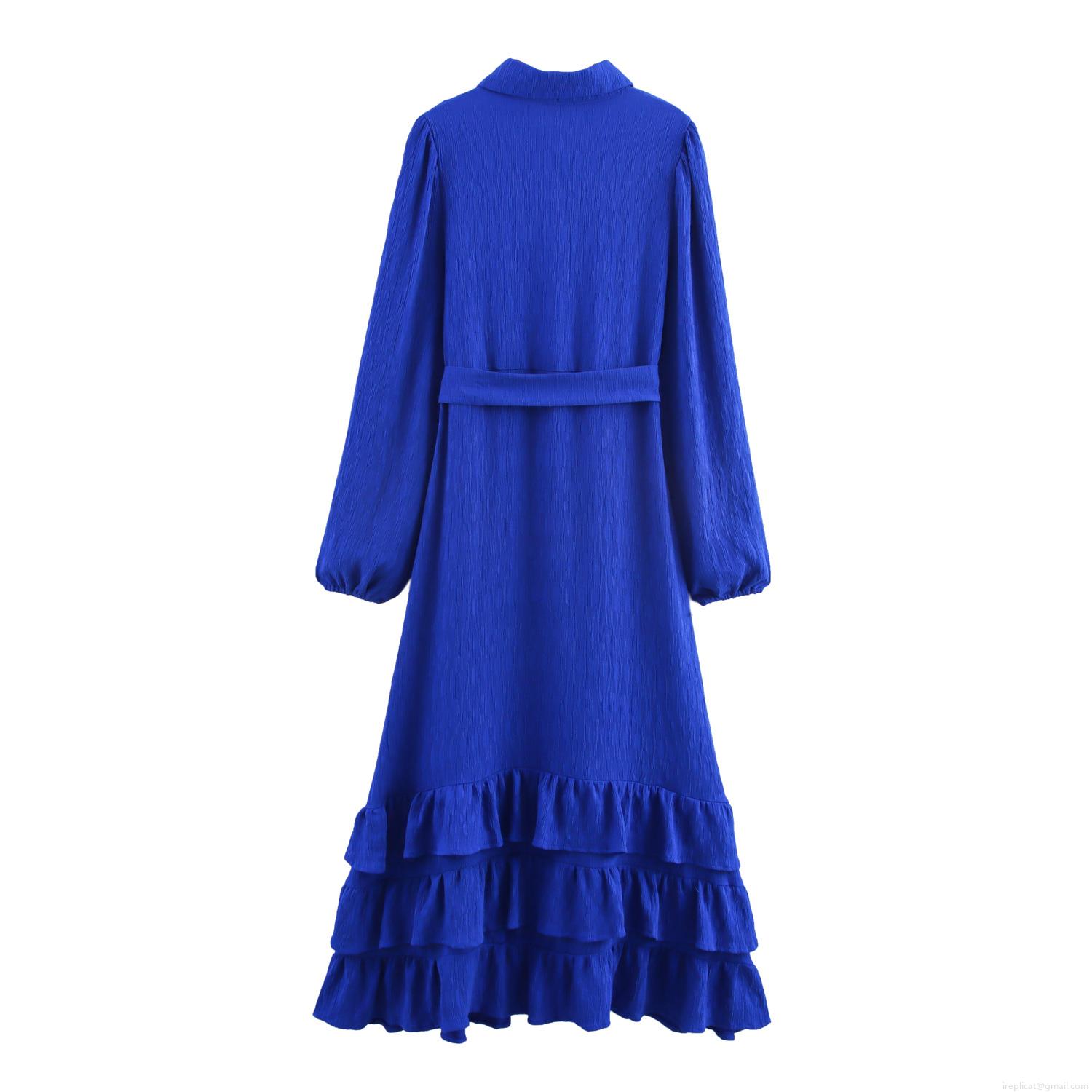 Elegant Klein Blue Ruffle Tiered Hem Shirt Maxi Dress For Women Long Sleeve Lapel Collar Tie Waist Pleated Crinkle Texture Office Lady Party Dress