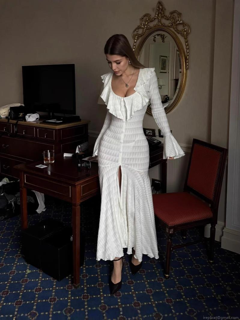 Elegant Knit Maxi Dress Women V Neck Ruffle Flare Sleeve Front Split Button Decor Slim Fit Long Sleeve Dress For Party Club Wedding Guest Lady Fashion