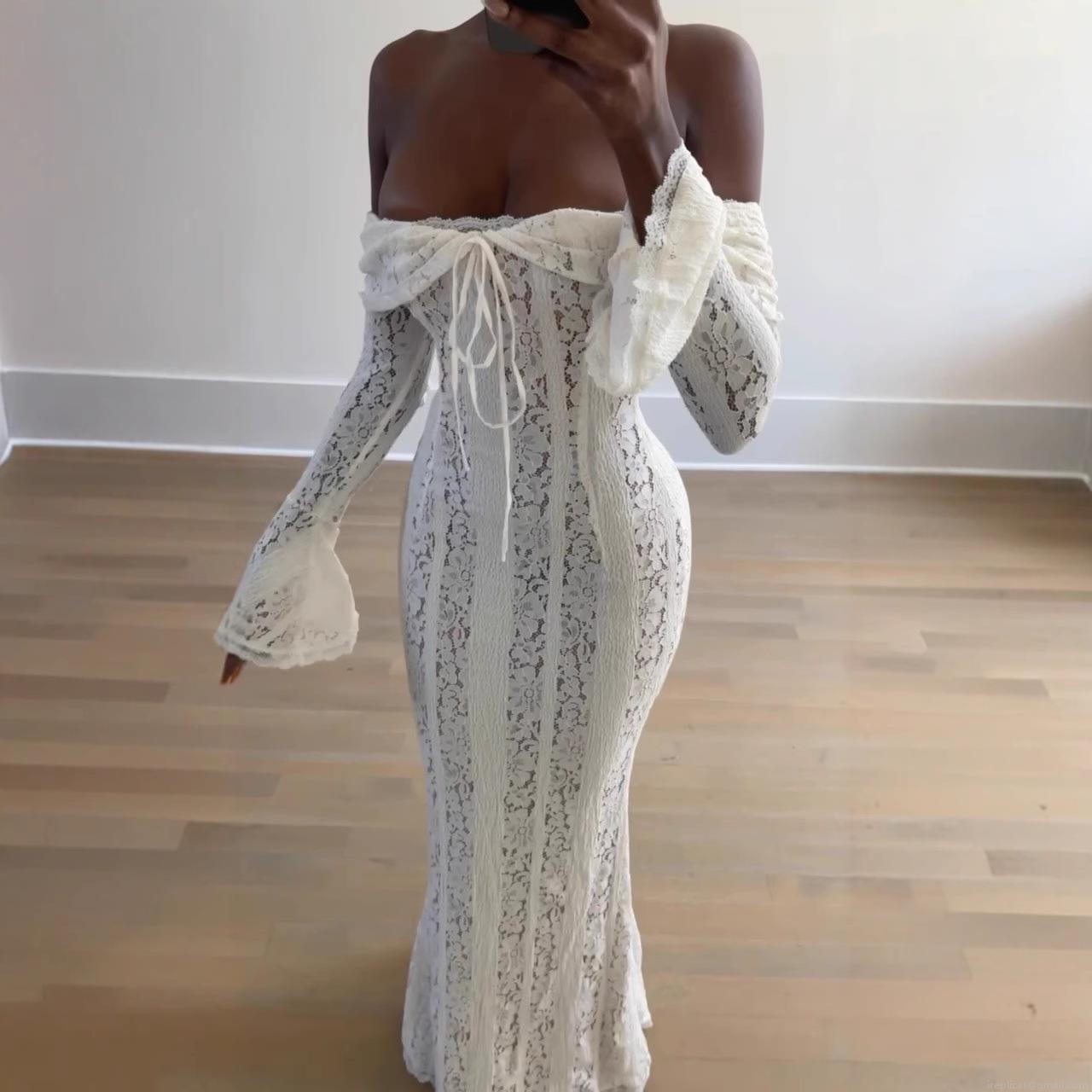 • Elegant Lace Off-the-Shoulder Maxi Dress Sexy Flare Sleeve Mermaid Evening Party Wedding Dress For Women French Vintage Style
