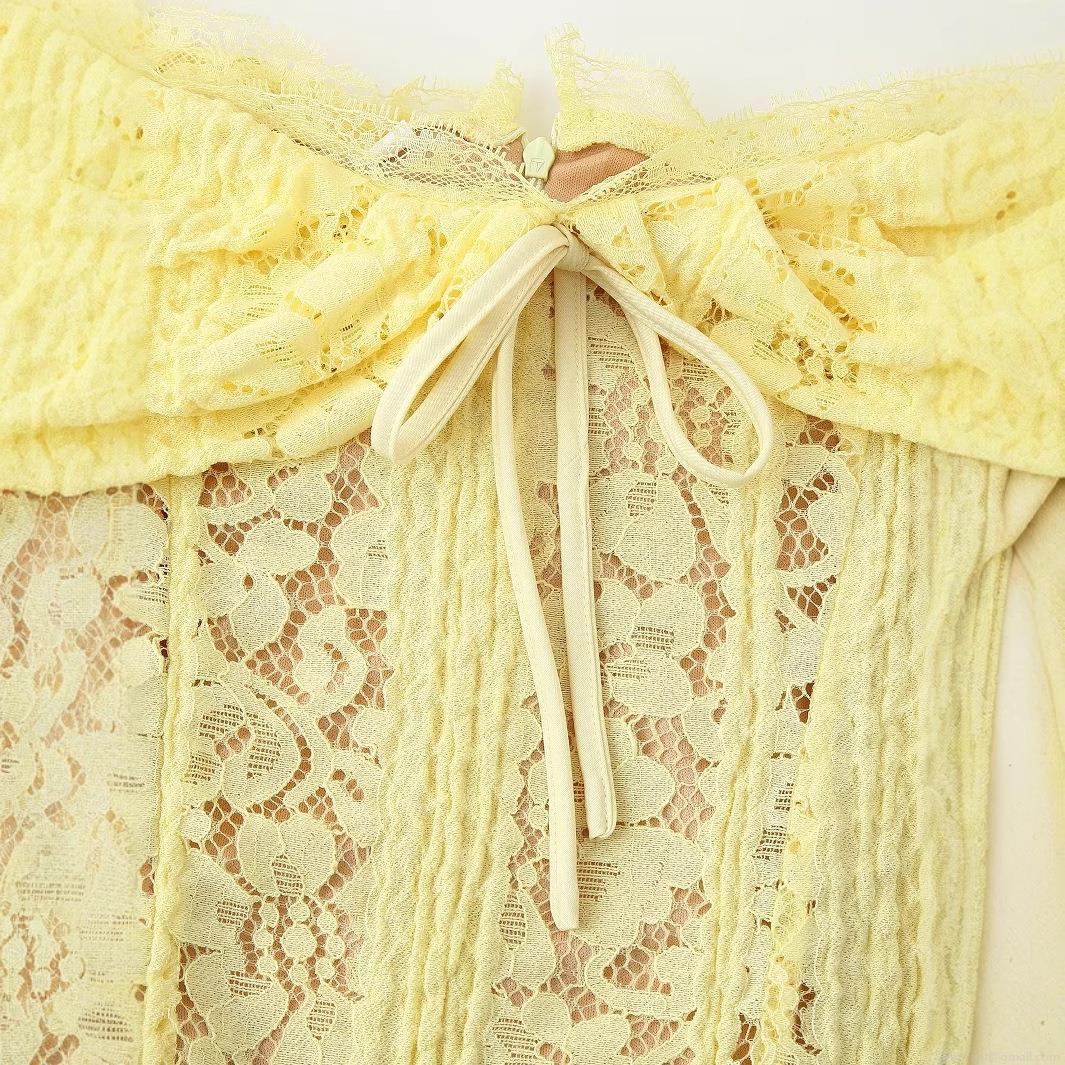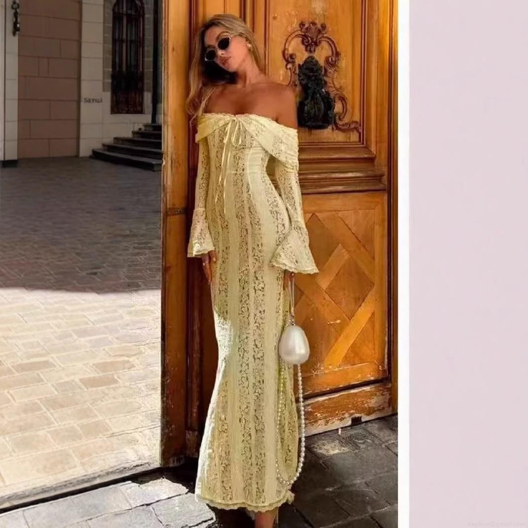 • Elegant Off-The-Shoulder Yellow Lace Maxi Dress Women Sexy Flare Sleeve Bodycon Mermaid Long Dress For Wedding Party Evening Date Night
