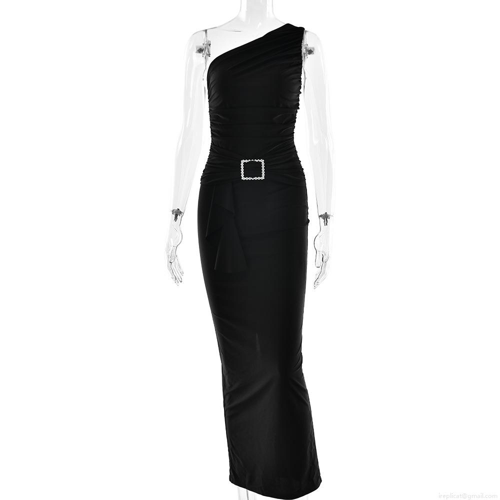 Solid Color, One Shoulder, Pleats, Side Fork, Rhinestone Square Buckle