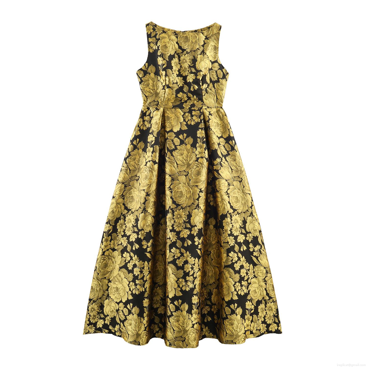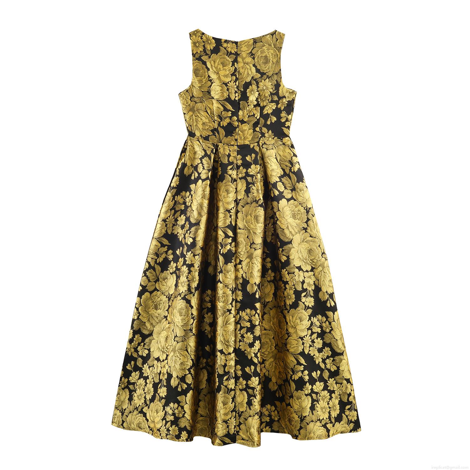 Elegant Retro Jacquard Floral Sleeveless Maxi Dress For Women High Waist Brocade Evening Party Ball Gown Dress Black Gold Floral Print Long Dress