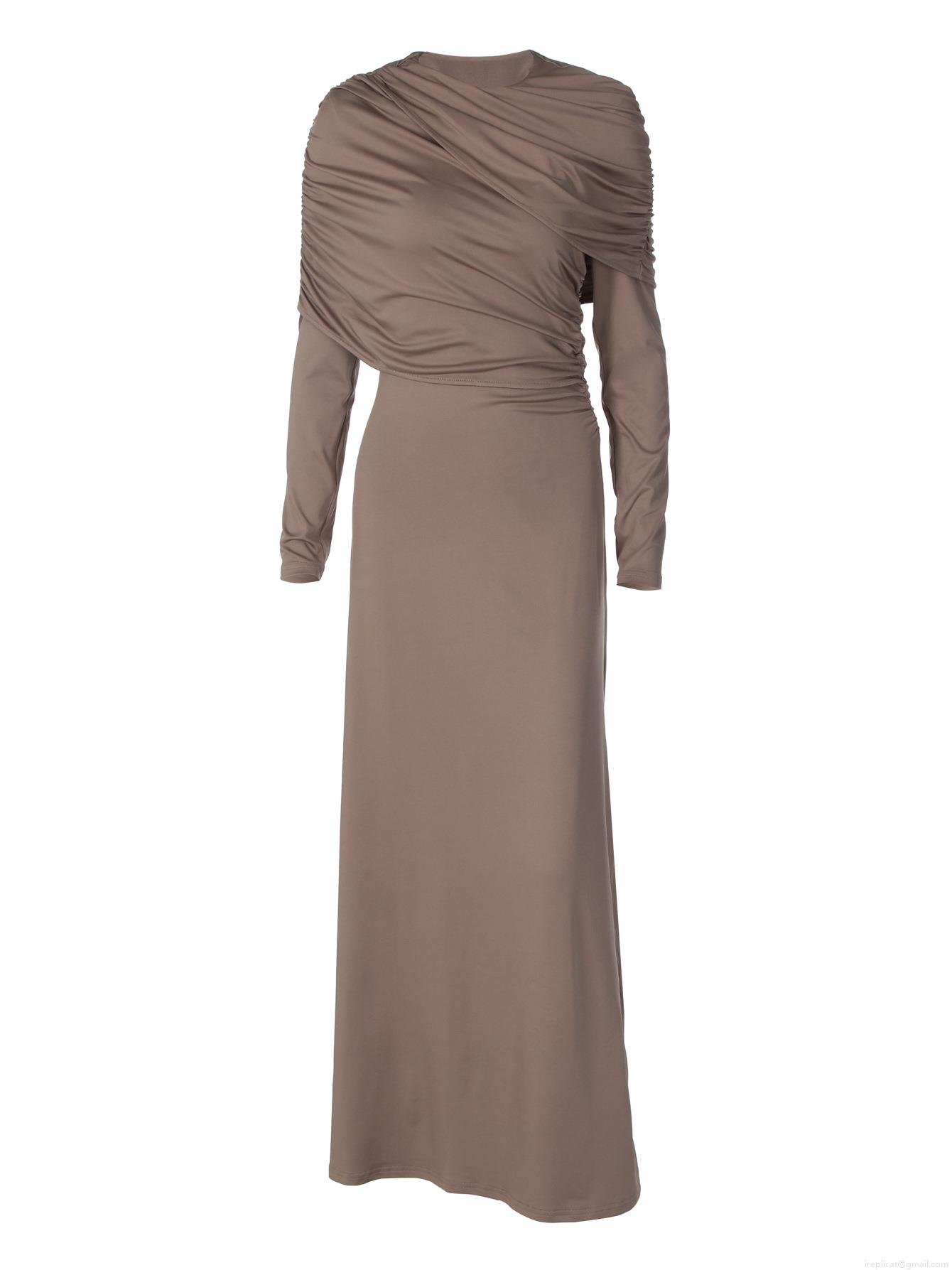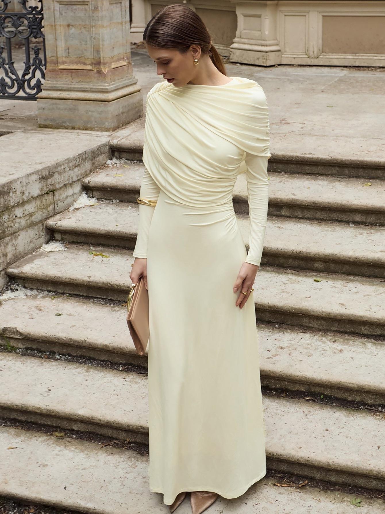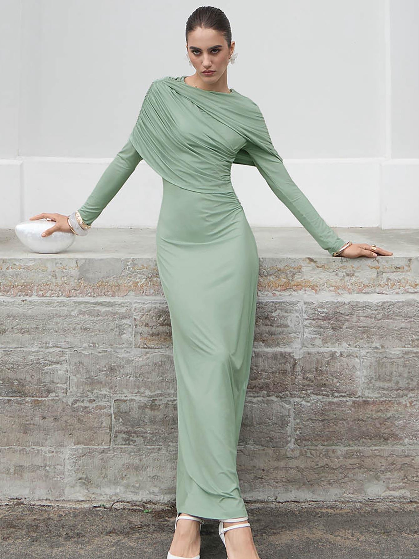 • Elegant Ruched Maxi Dress for Women Sexy Slim Fit Long Sleeve Solid Color Draped Floor Length Dress for Party Evening Club Socializing Polyester Spandex Blend