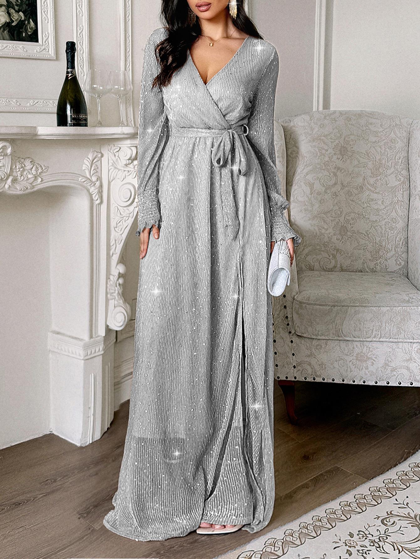 • Elegant Silver V-Neck Sequin Maxi Dress For Women Long Sleeve High Split Wrap Party Evening Dress With Waist Tie Shiny Sparkly A-Line Gown