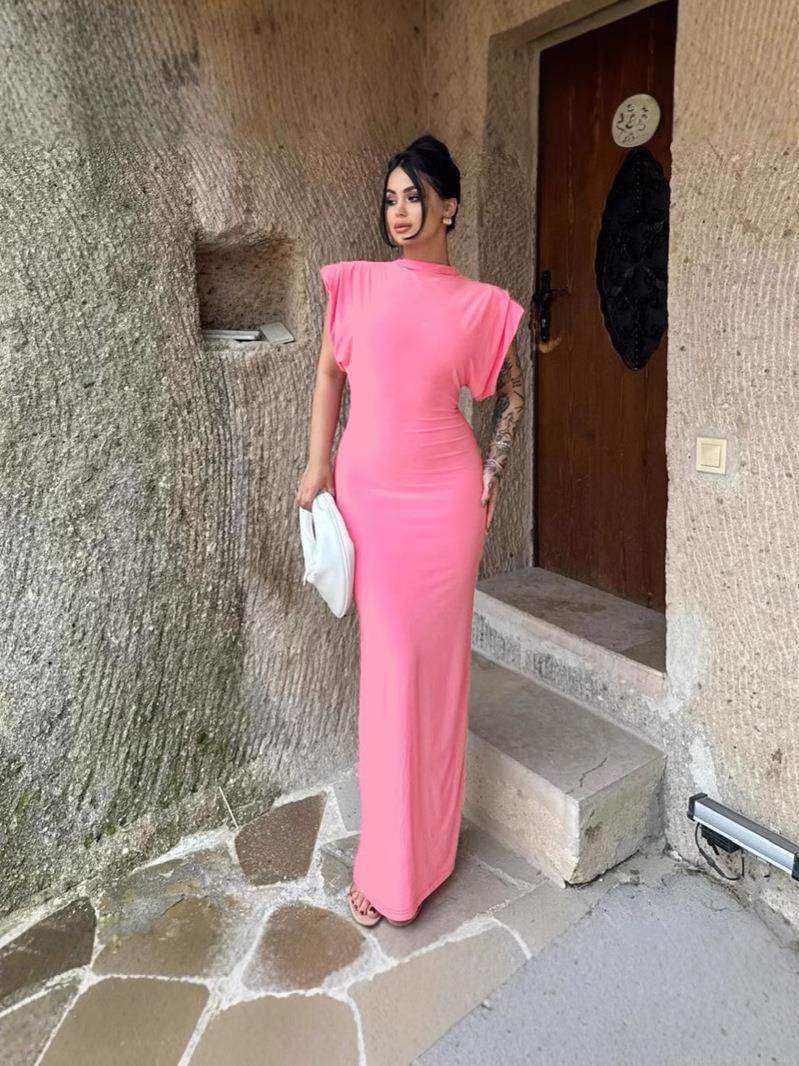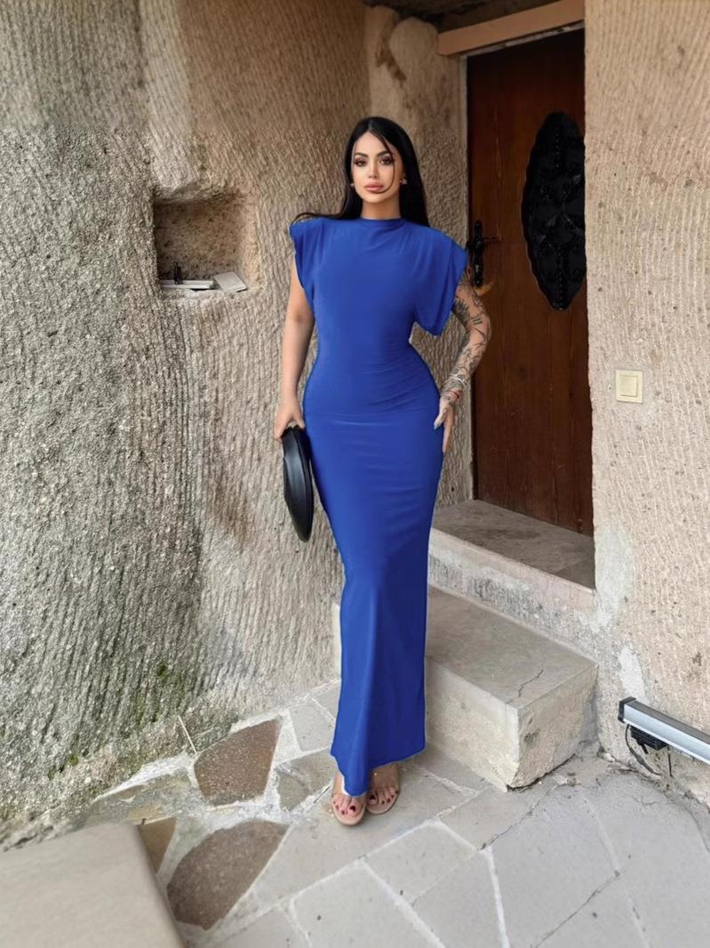 • Elegant Sleeveless Maxi Dress For Women Padded Shoulder Back Slit Polyester Spandex Slim Fit Solid Color Party Evening Dress