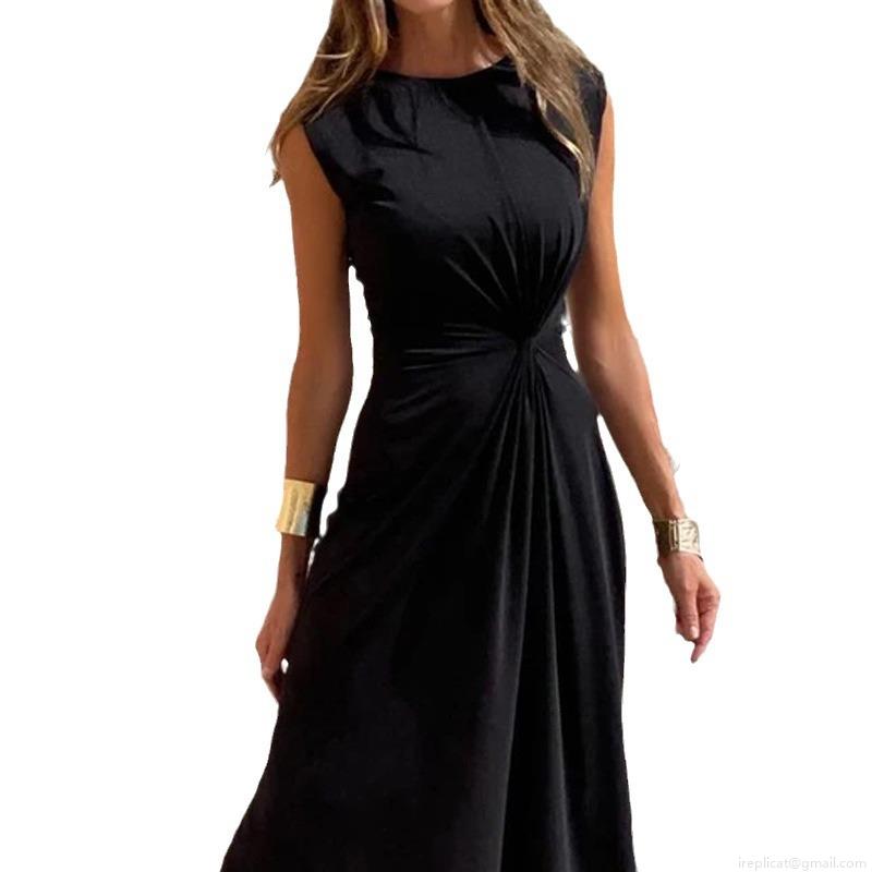 • Elegant Sleeveless Maxi Dress Polyester Spandex Milk Silk Twist Waist Cinching Round Neck Slim Fit Solid Color Casual Commute Long Dress For Women