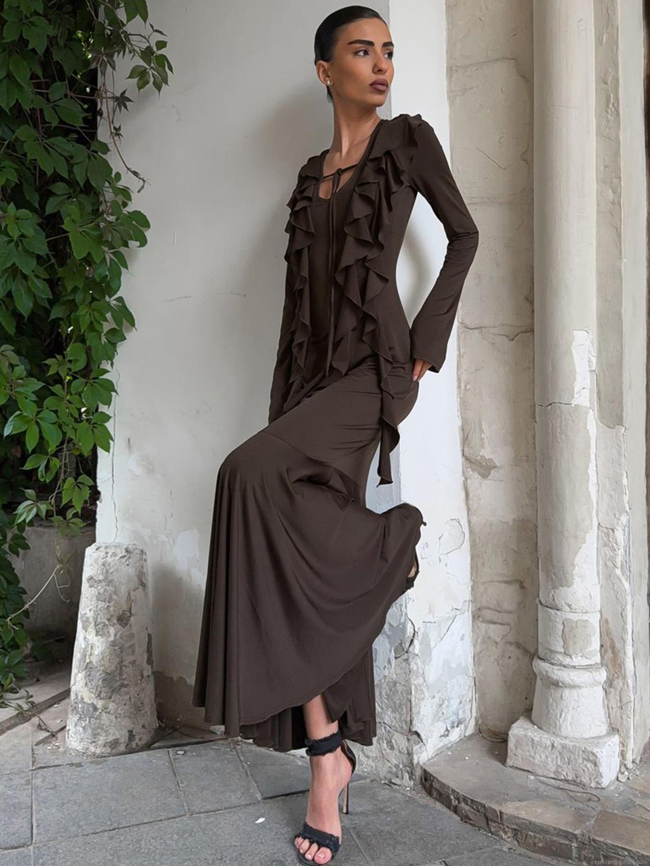 Elegant Solid Color Long Sleeve Ruffle Mermaid Maxi Dress With V-Neck Tie Polyester Spandex Slim Fit Bodycon Evening Party Long Dress For Women