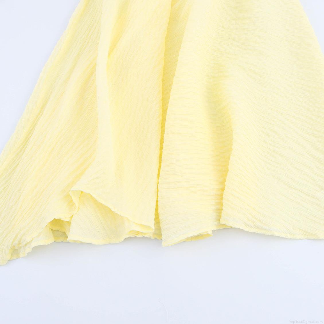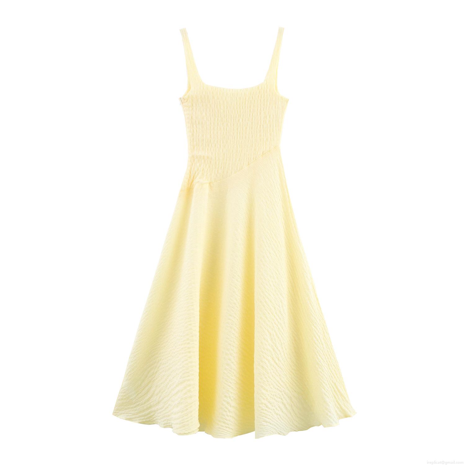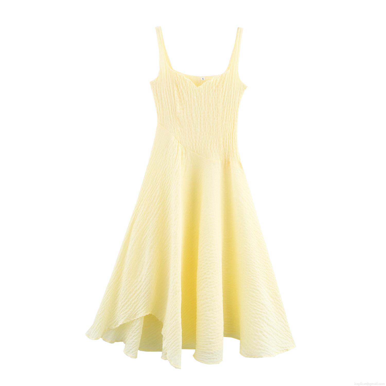 • Elegant Solid Color Pale Yellow Spaghetti Strap Dress For Women Summer Vacation Party Texture Pleated Asymmetrical Hem Maxi Dress