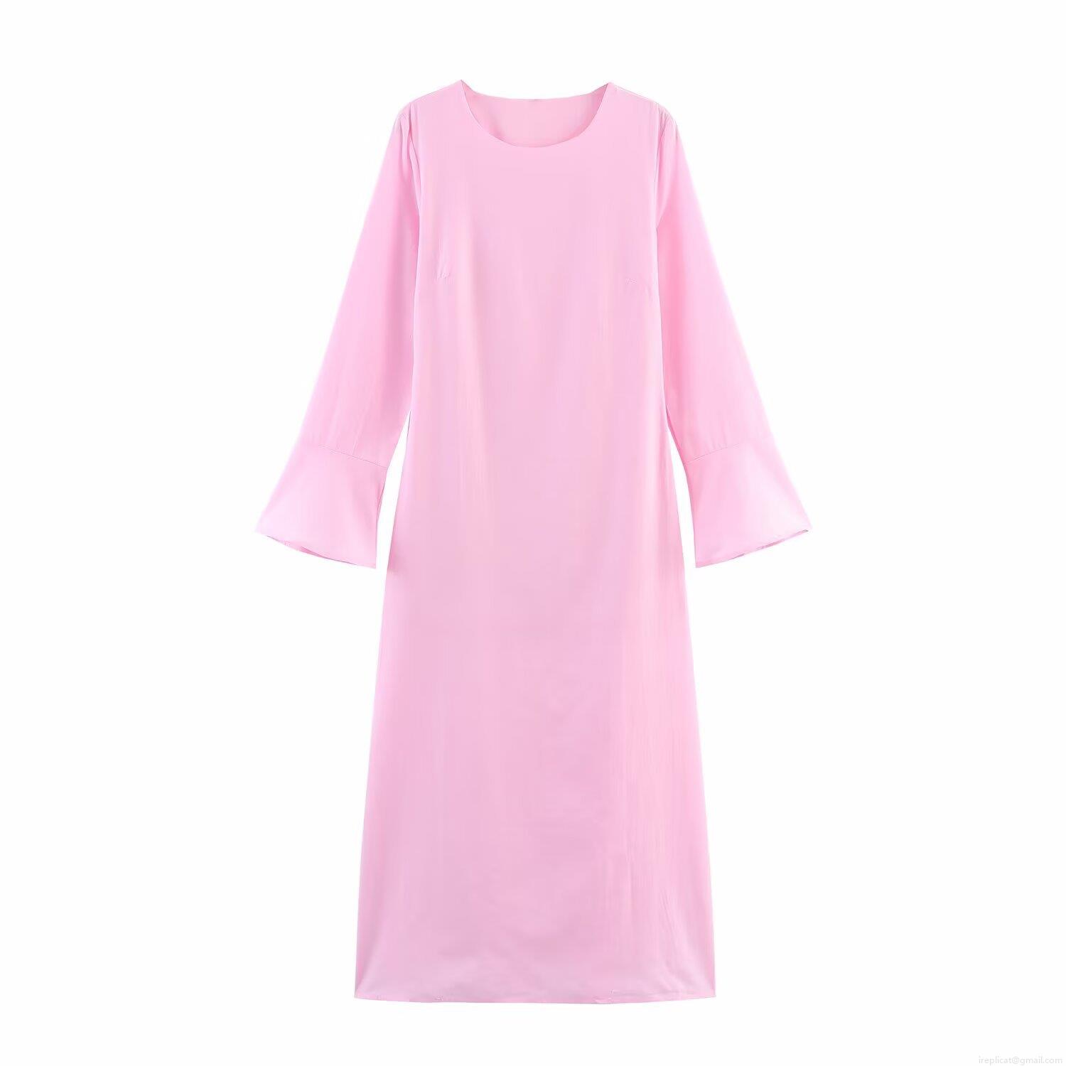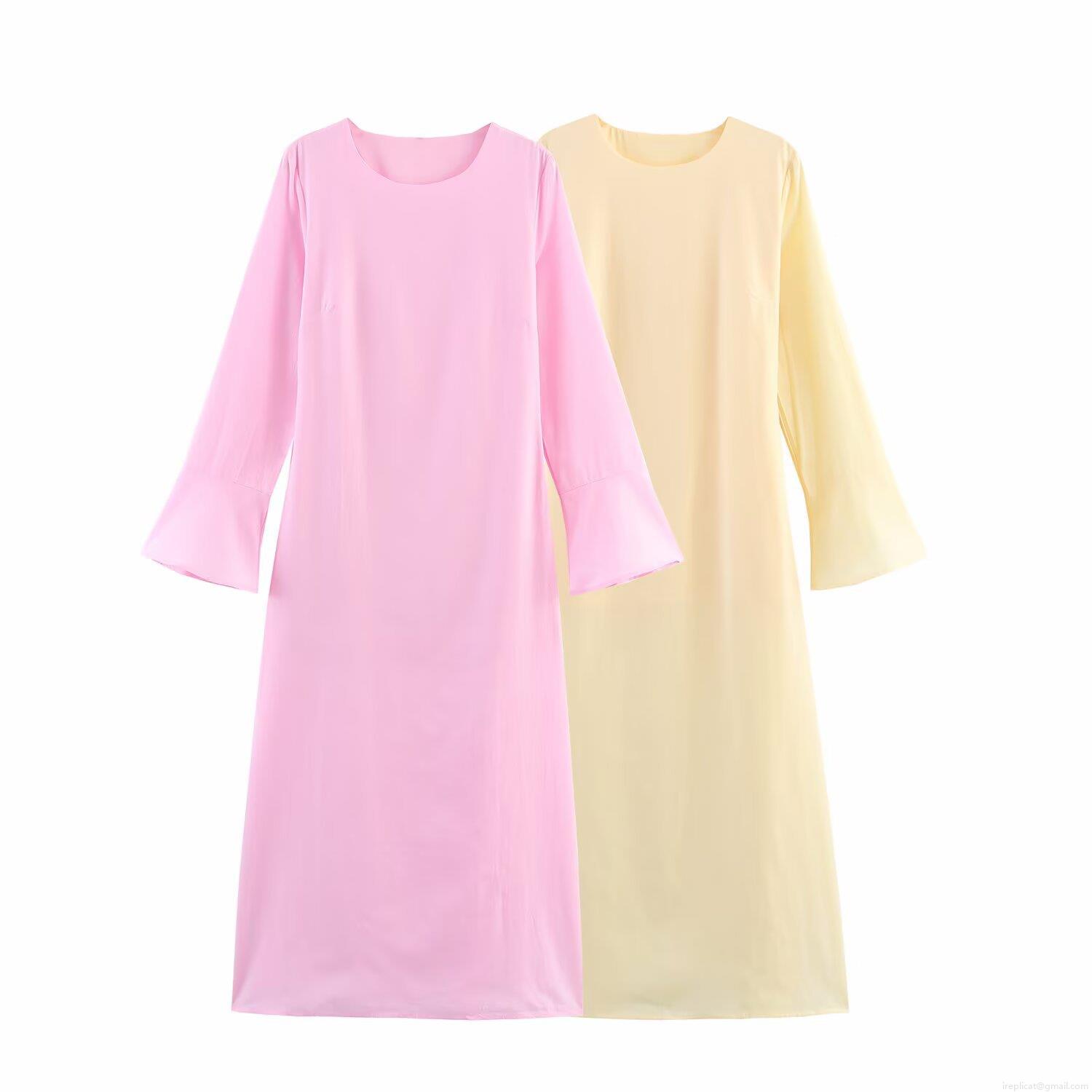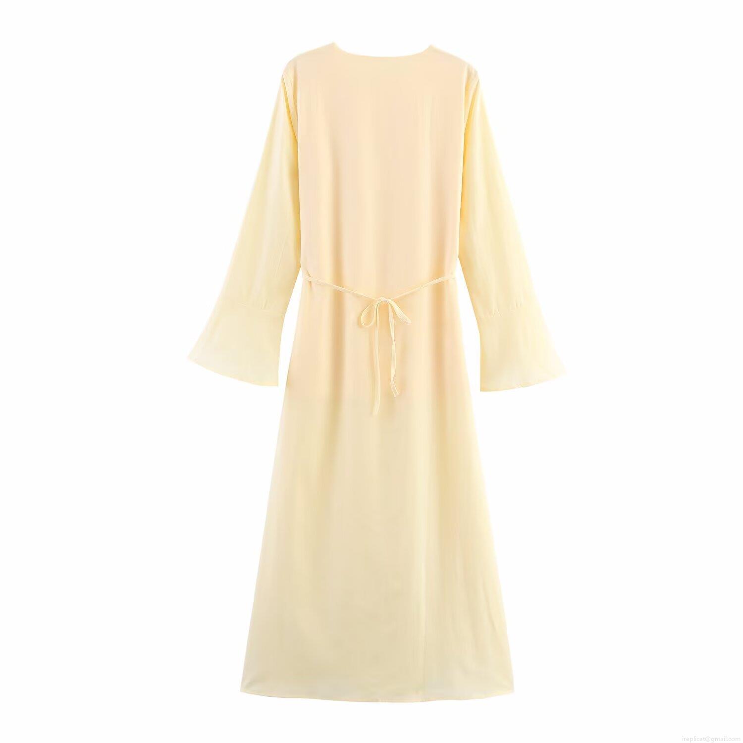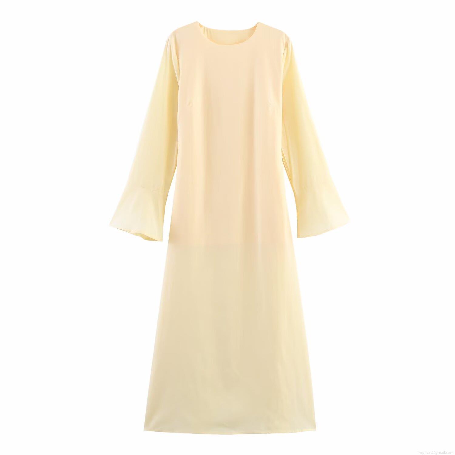 • Elegant Solid Color Round Neck Bell Sleeve Maxi Dress With Waist Tie Polyester Long Sleeve Dresses For Women Party Vacation