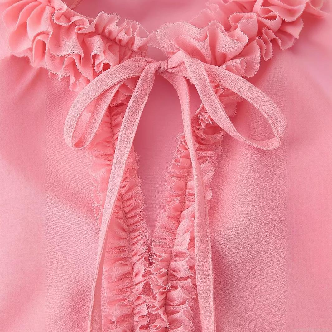• Elegant Solid Color Ruffle Chiffon Maxi Dress For Women With Bow Tie Neck Long Sleeve Tiered Hem 100% Polyester Loose Party Vacation Dress