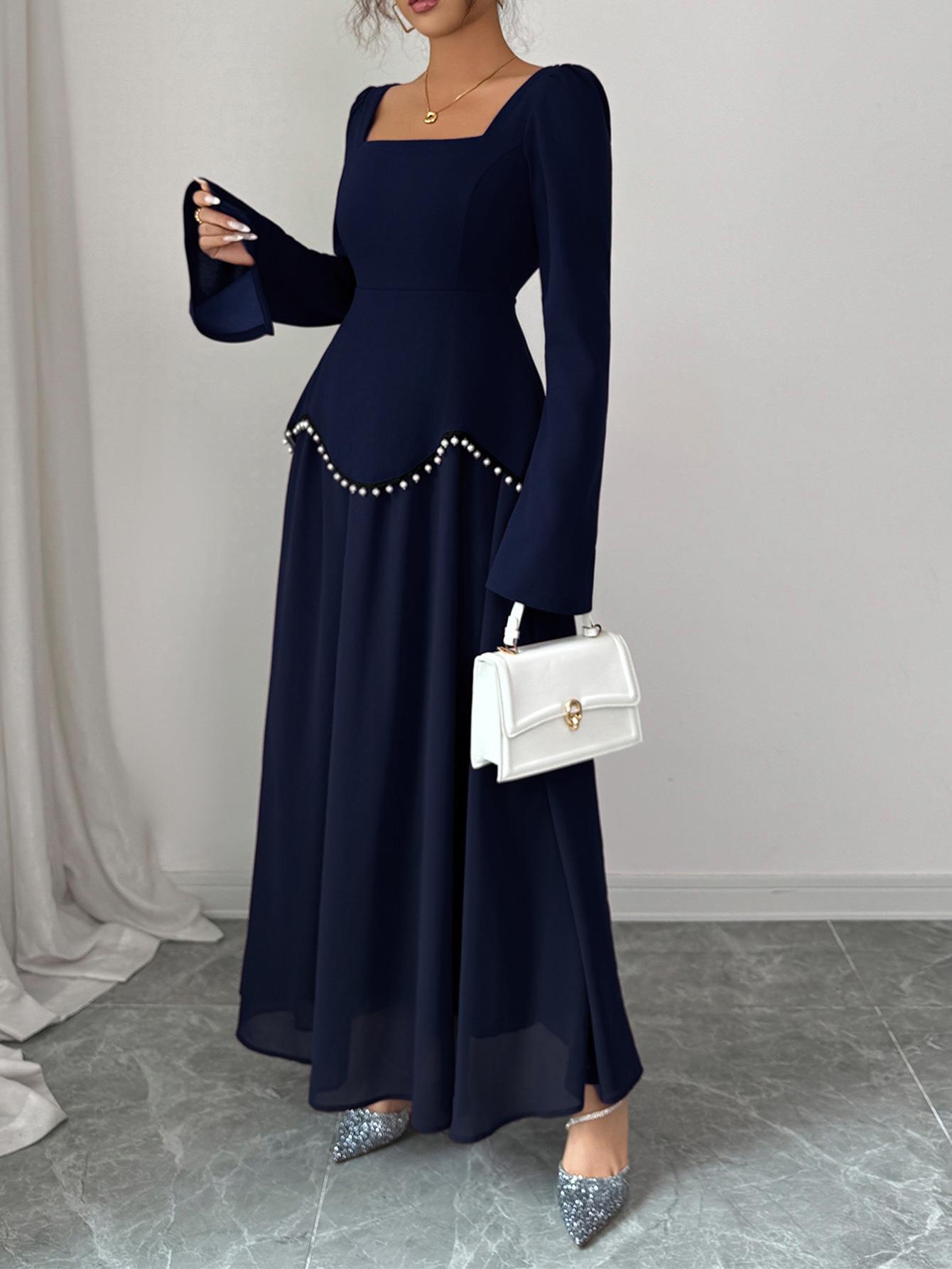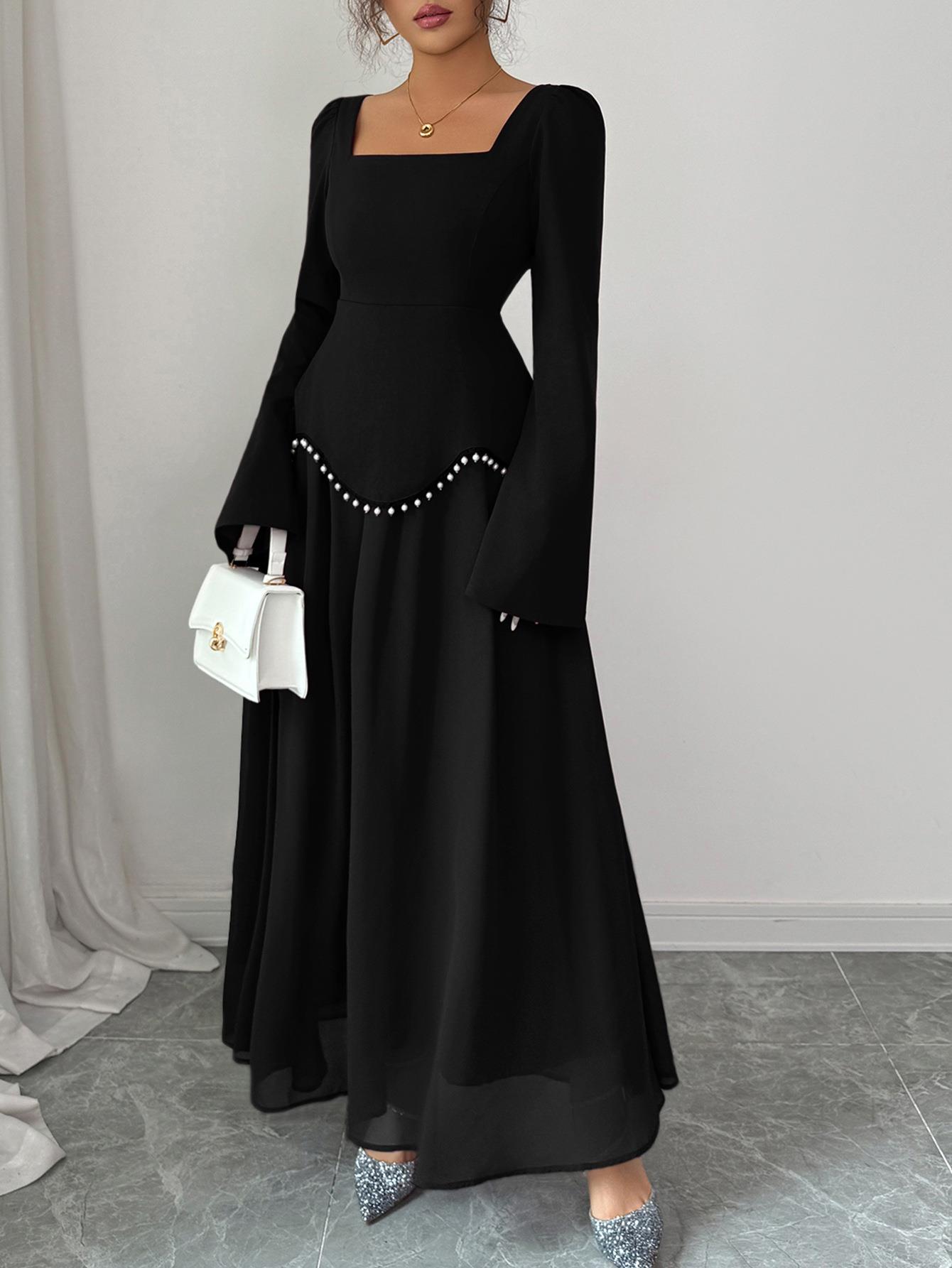 • Elegant Square Neck Long Sleeve Maxi Dress Polyester Pearl Waist A-Line Evening Gown For Wedding Party Women Banquet Formal Fall Winter Dress