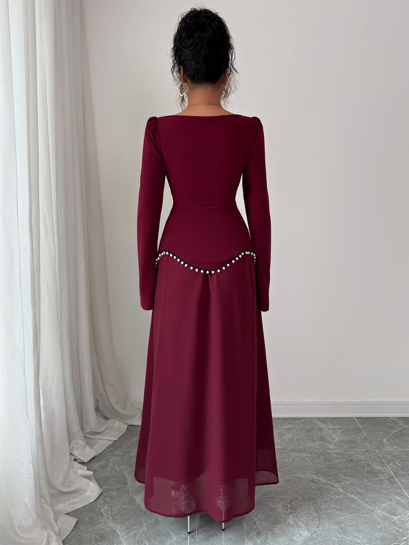 Elegant Square Neck Long Sleeve Maxi Dress Polyester Pearl Waist A-Line Evening Gown For Wedding Party Women Banquet Formal Fall Winter Dress
