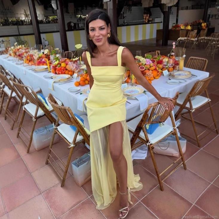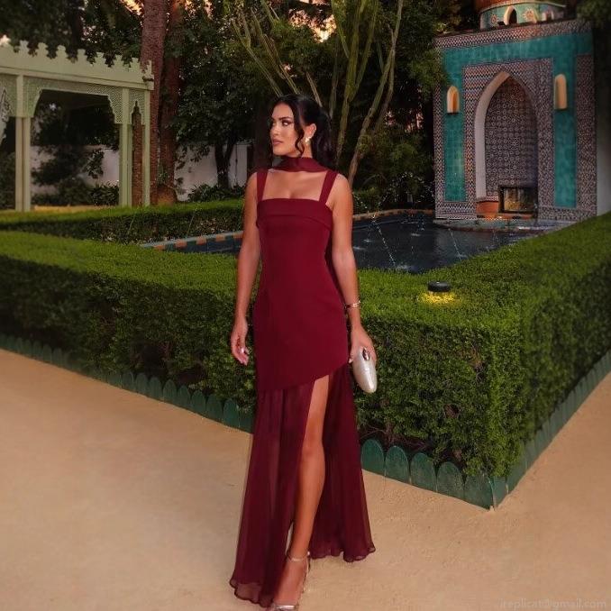 • Elegant Square Neck Sling Maxi Dress With Mesh Patchwork Sexy High Slit Asymmetrical Evening Party Gown For Women Summer Solid Dress