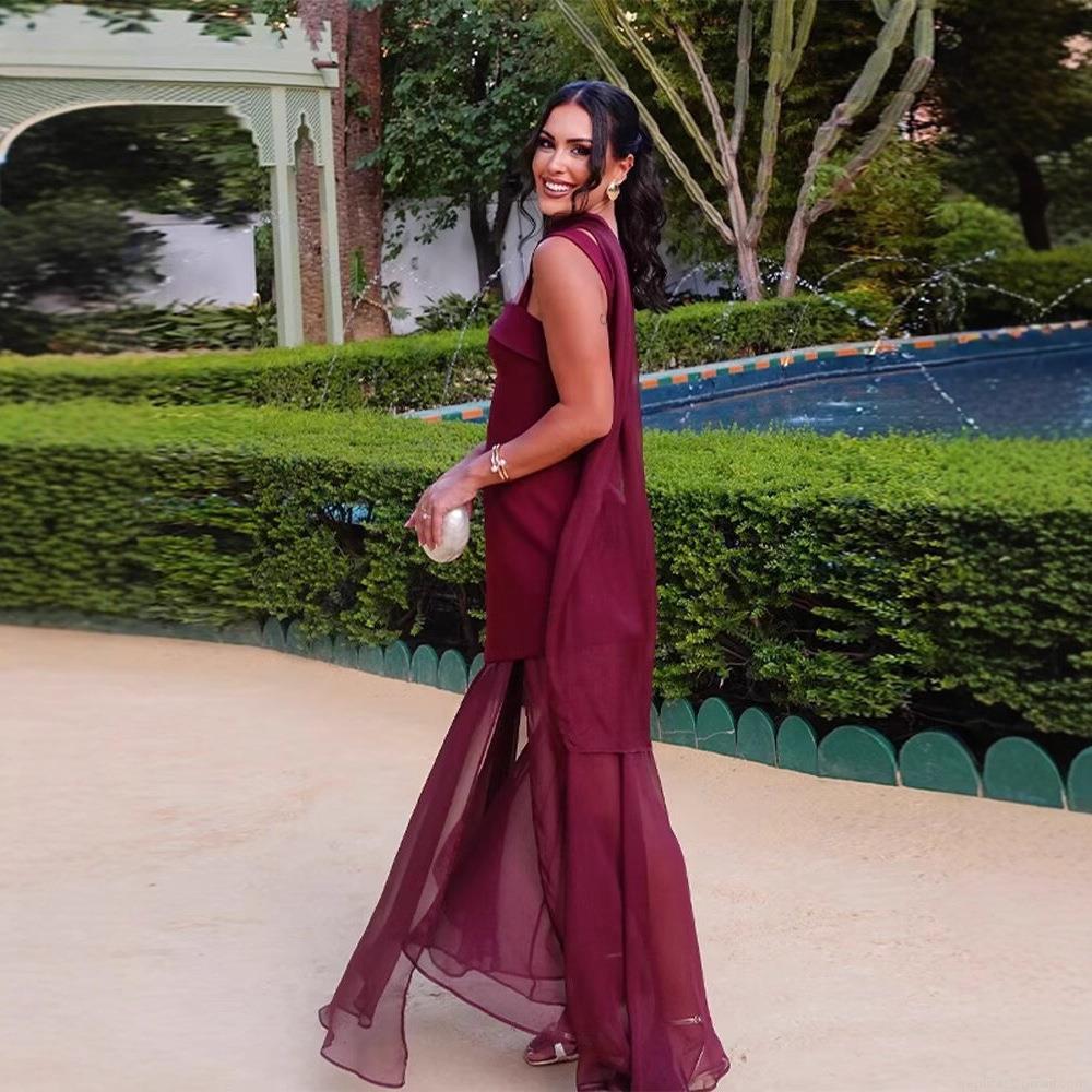 Elegant Square Neck Sling Maxi Dress With Mesh Patchwork Sexy High Slit Asymmetrical Evening Party Gown For Women Summer Solid Dress
