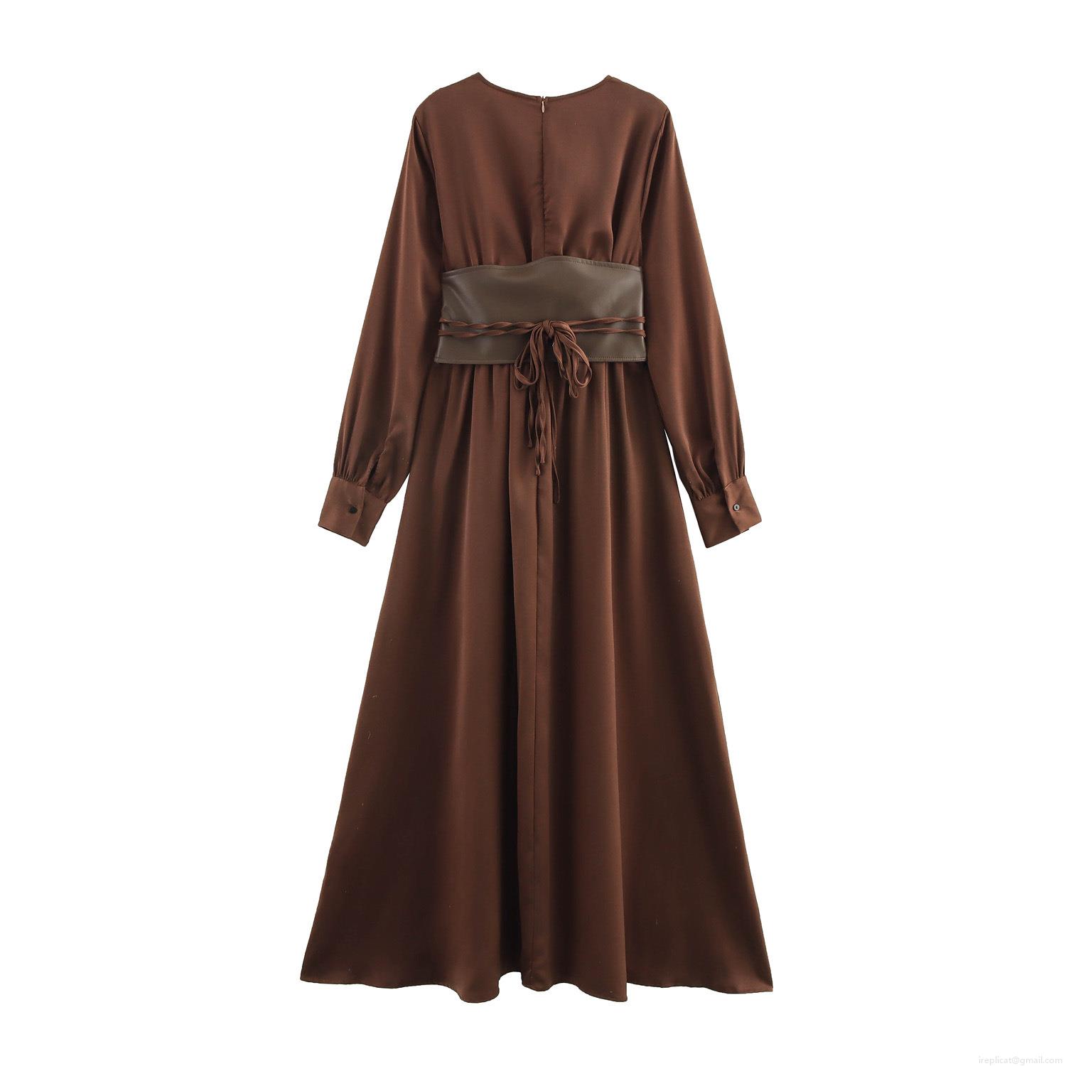 • Elegant V Neck Long Sleeve Maxi Dress For Women Solid Color Deep Brown Pleated Dress With Waist Belt Intellectual Office Commuter Bohemian Long Dress