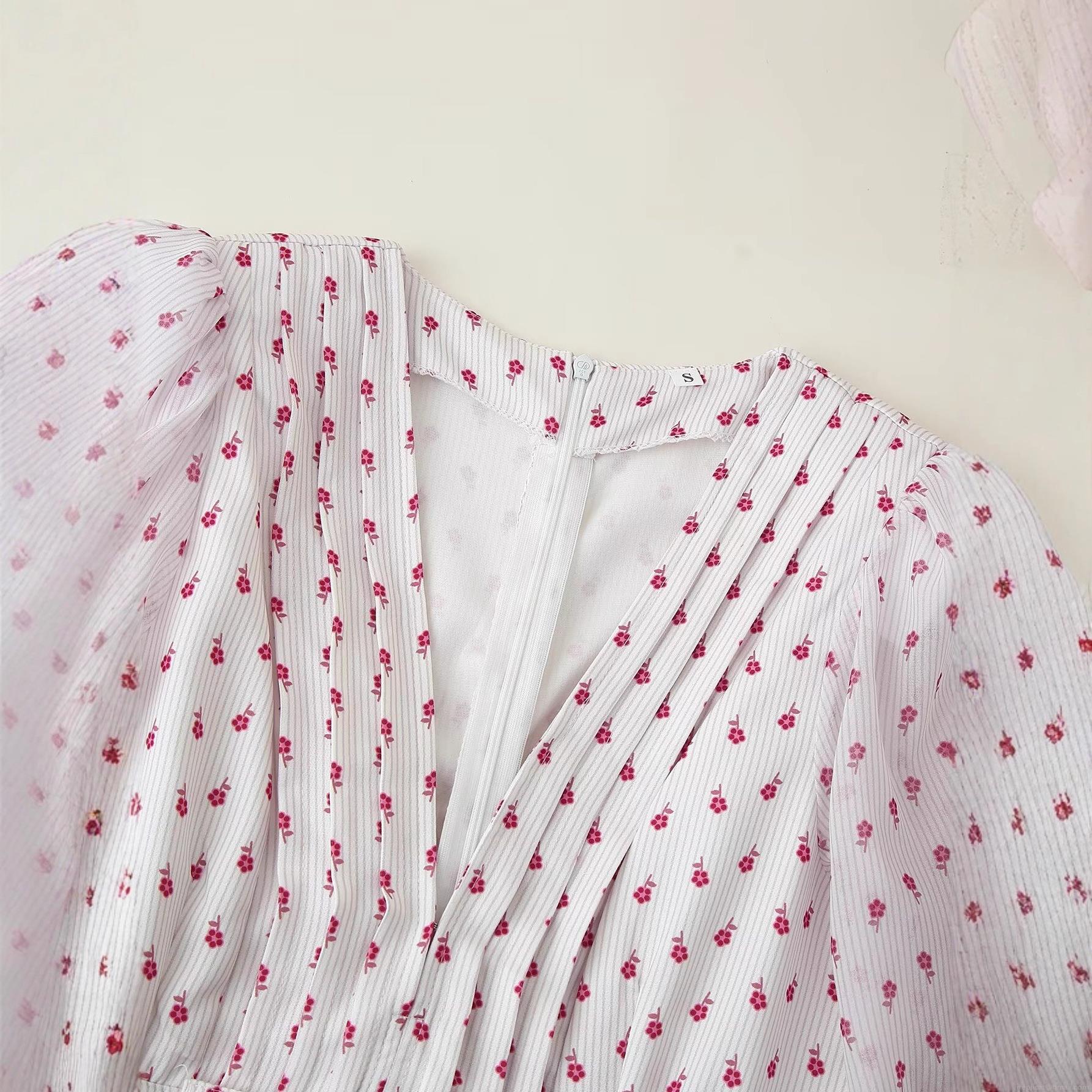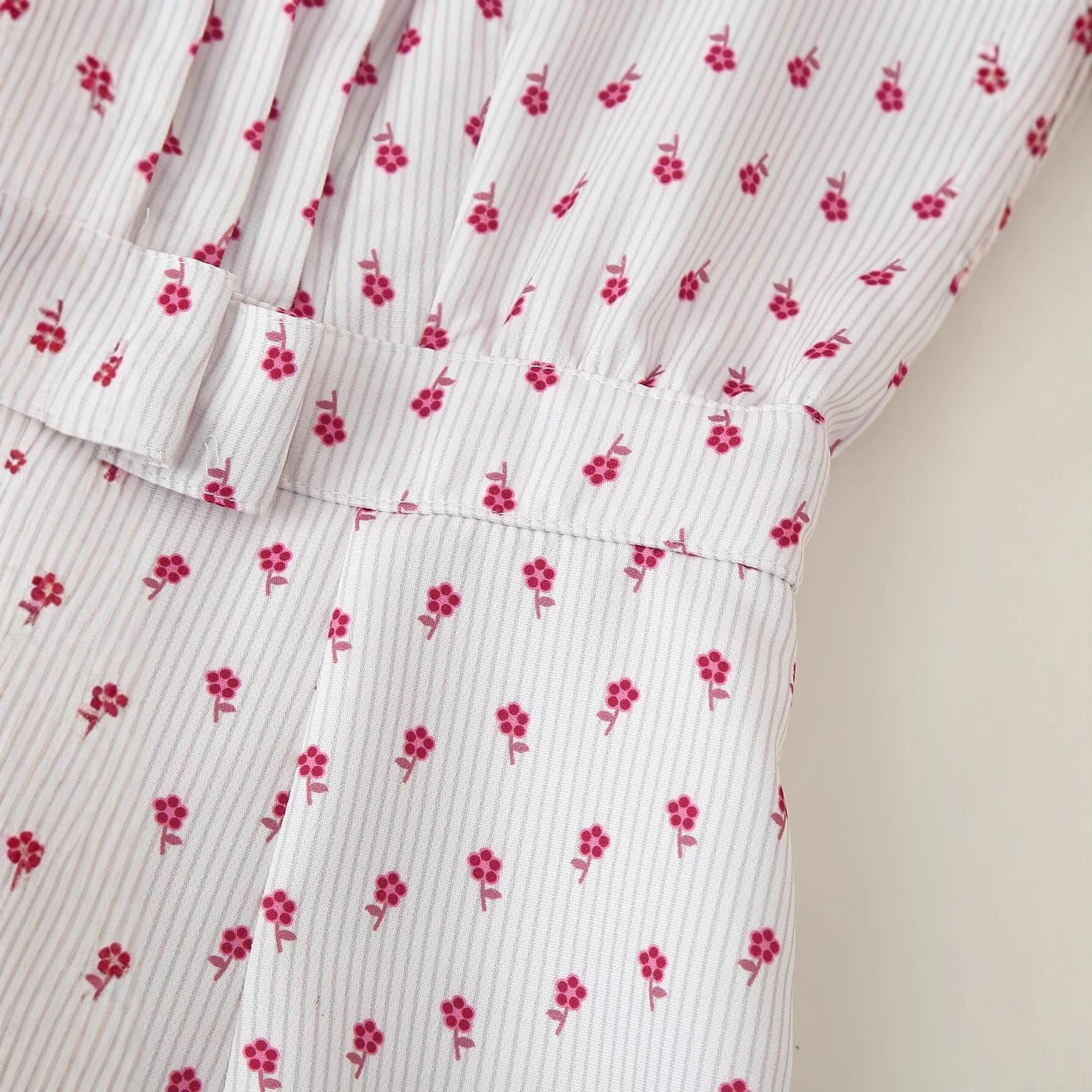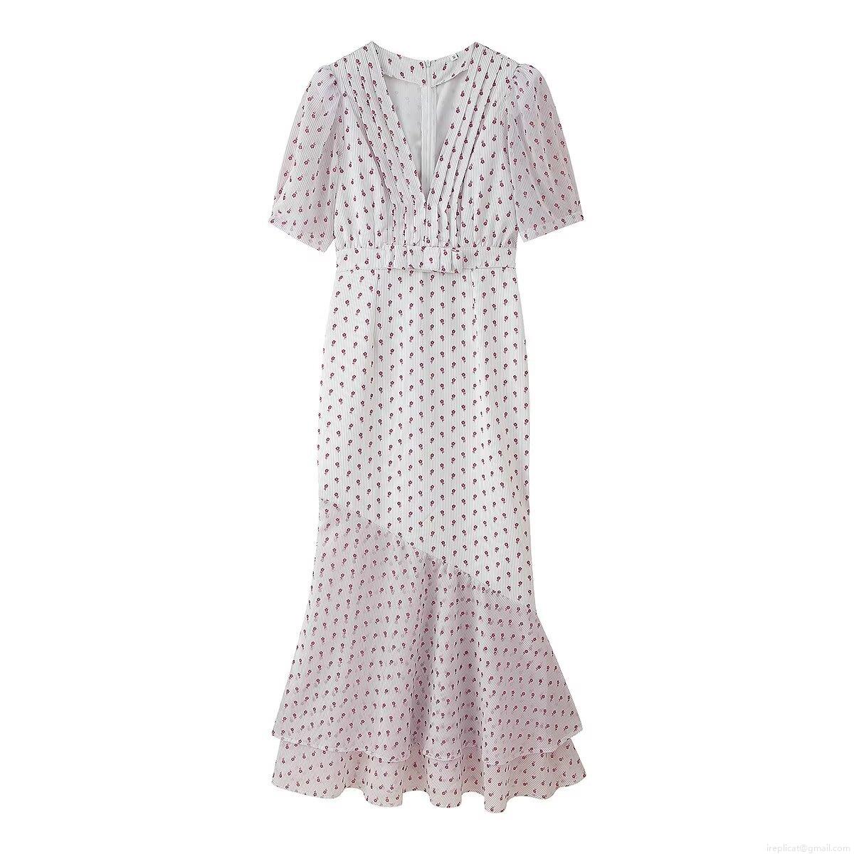 • Elegant V-Neck Polyester Floral Maxi Dress For Women Slim Fit Fishtail Puff Sleeve Bodycon Party Dresses With Fine Stripes