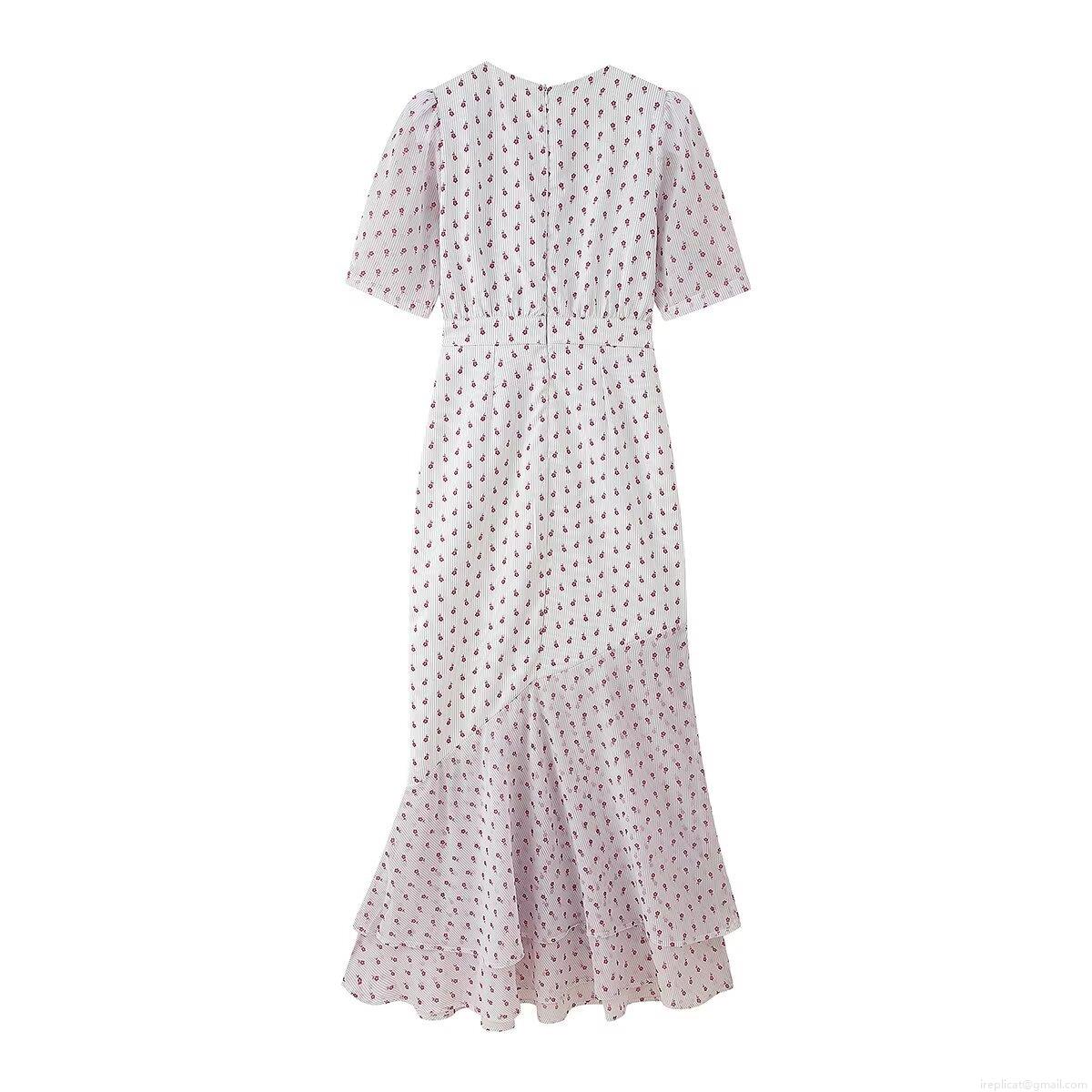 Pinstripes, Ruffles, Flowers, V-neck, Puff Sleeves, Fishtail