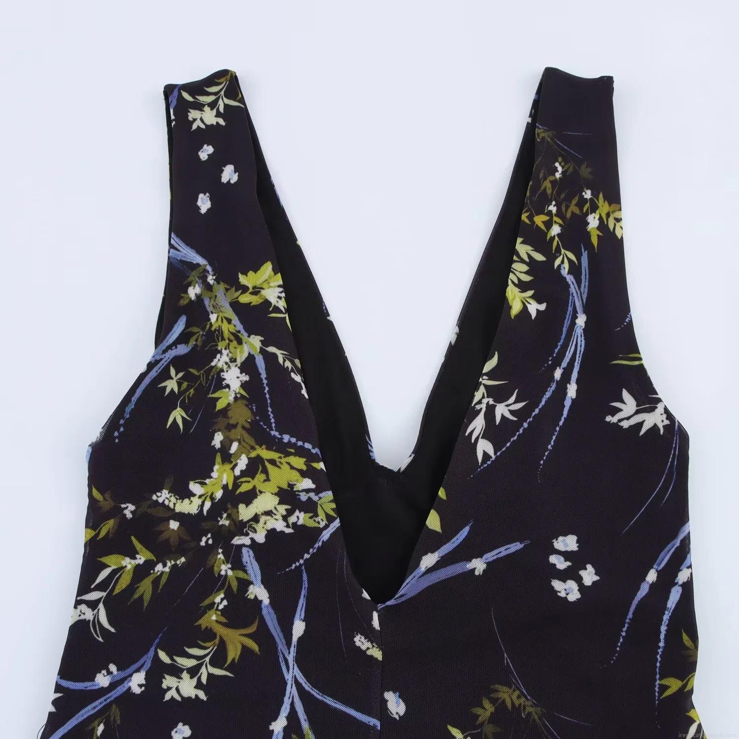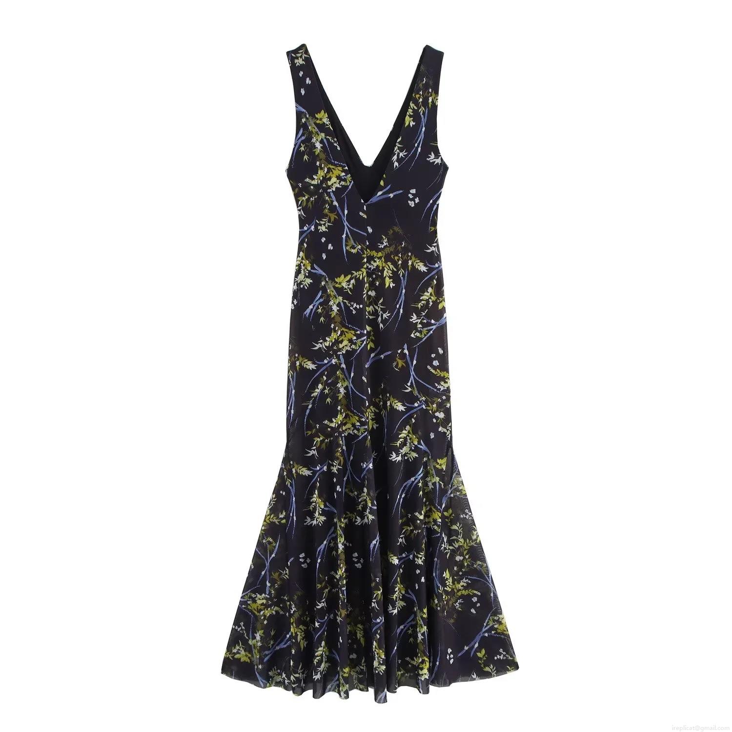 Elegant V-Neck Sleeveless Floral Mesh Maxi Dress Slim Waist Fishtail Hem Women's Summer Beach Party Long Dress Patterned Socialite Style