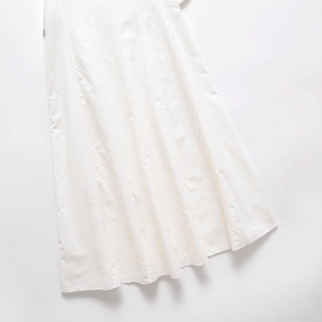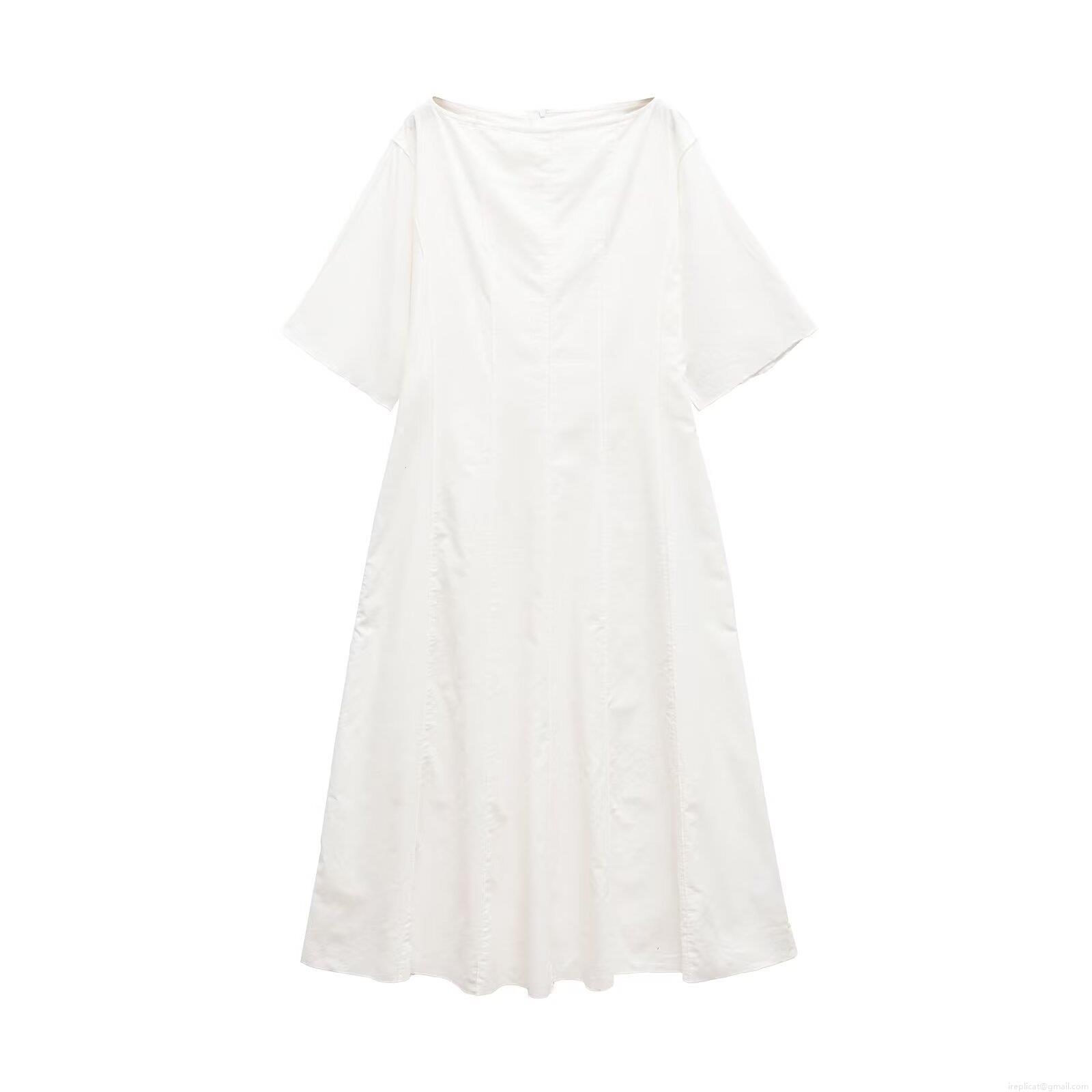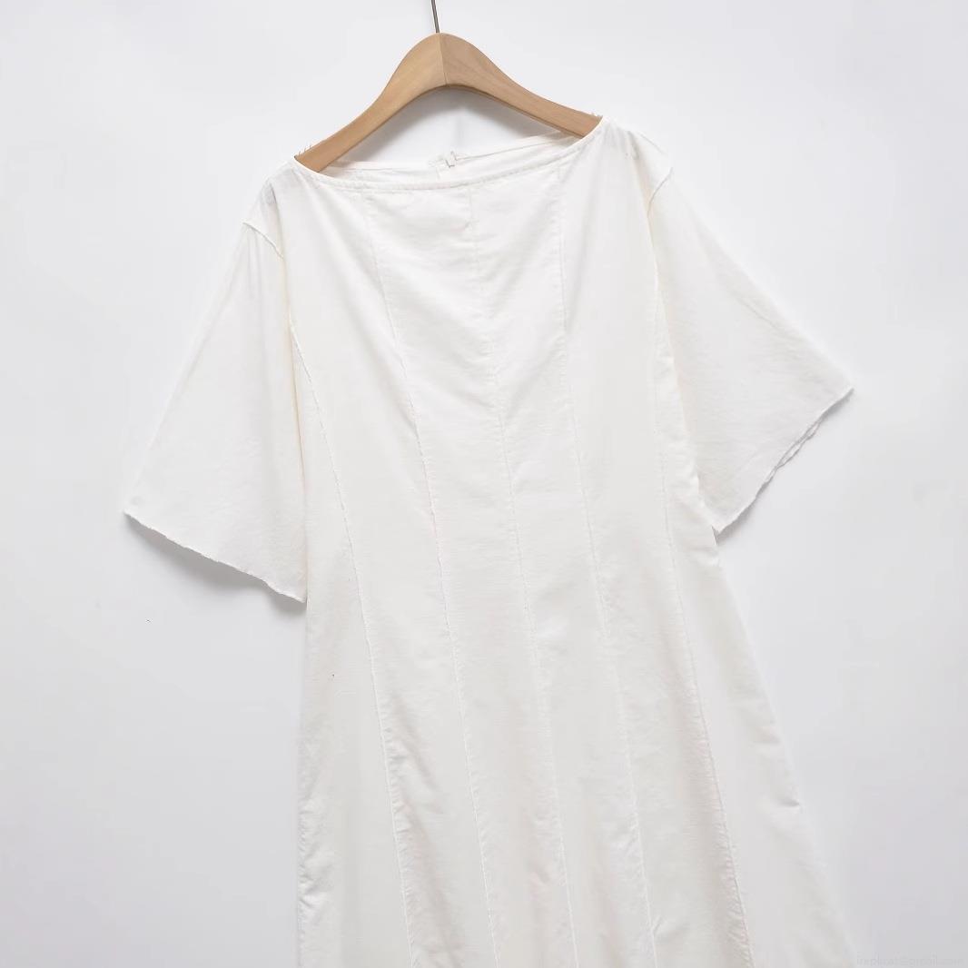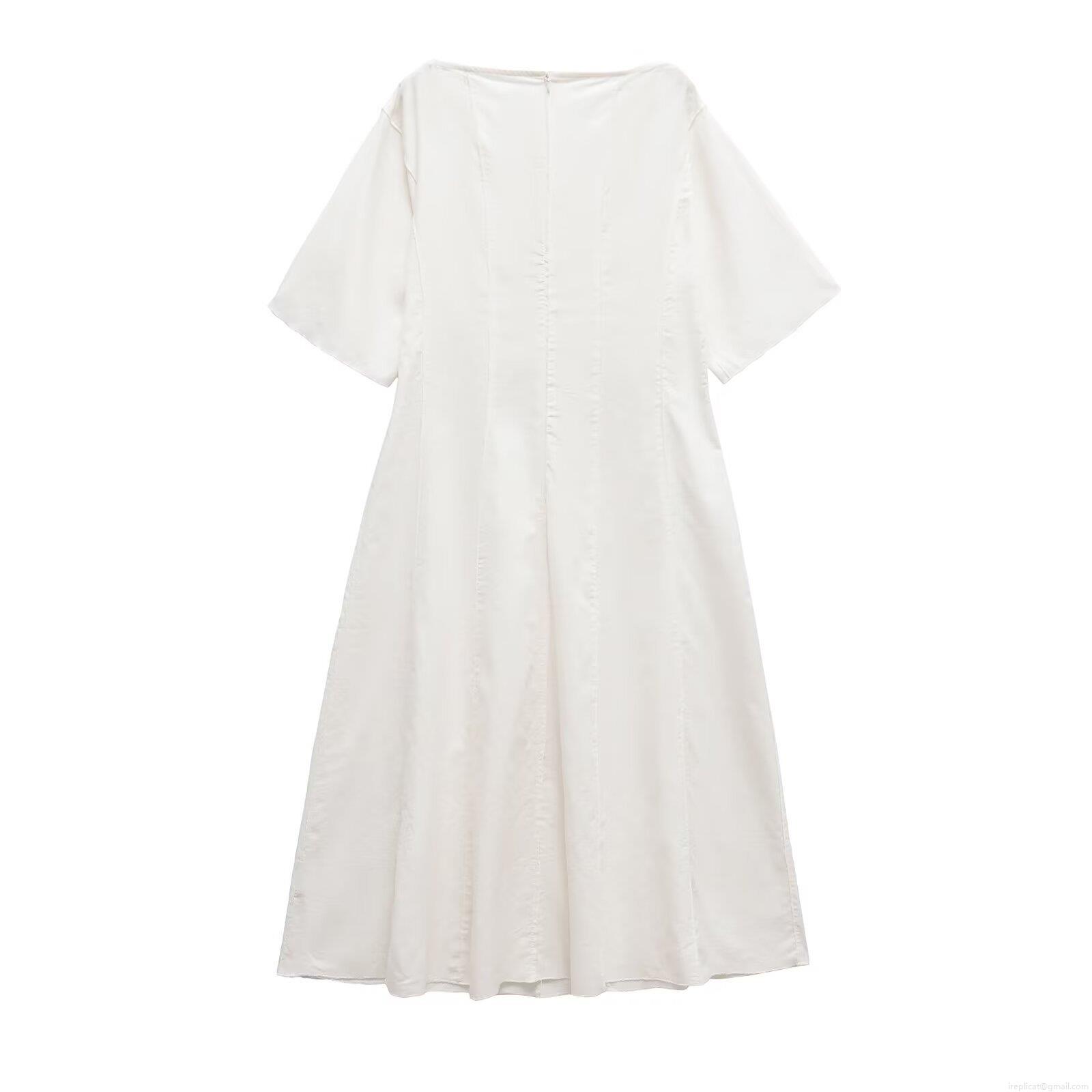 • Elegant White Linen Blend Maxi Dress Boat Neck Short Sleeve Seam Design Minimalist Summer Long Dress For Women Casual Vacation Party