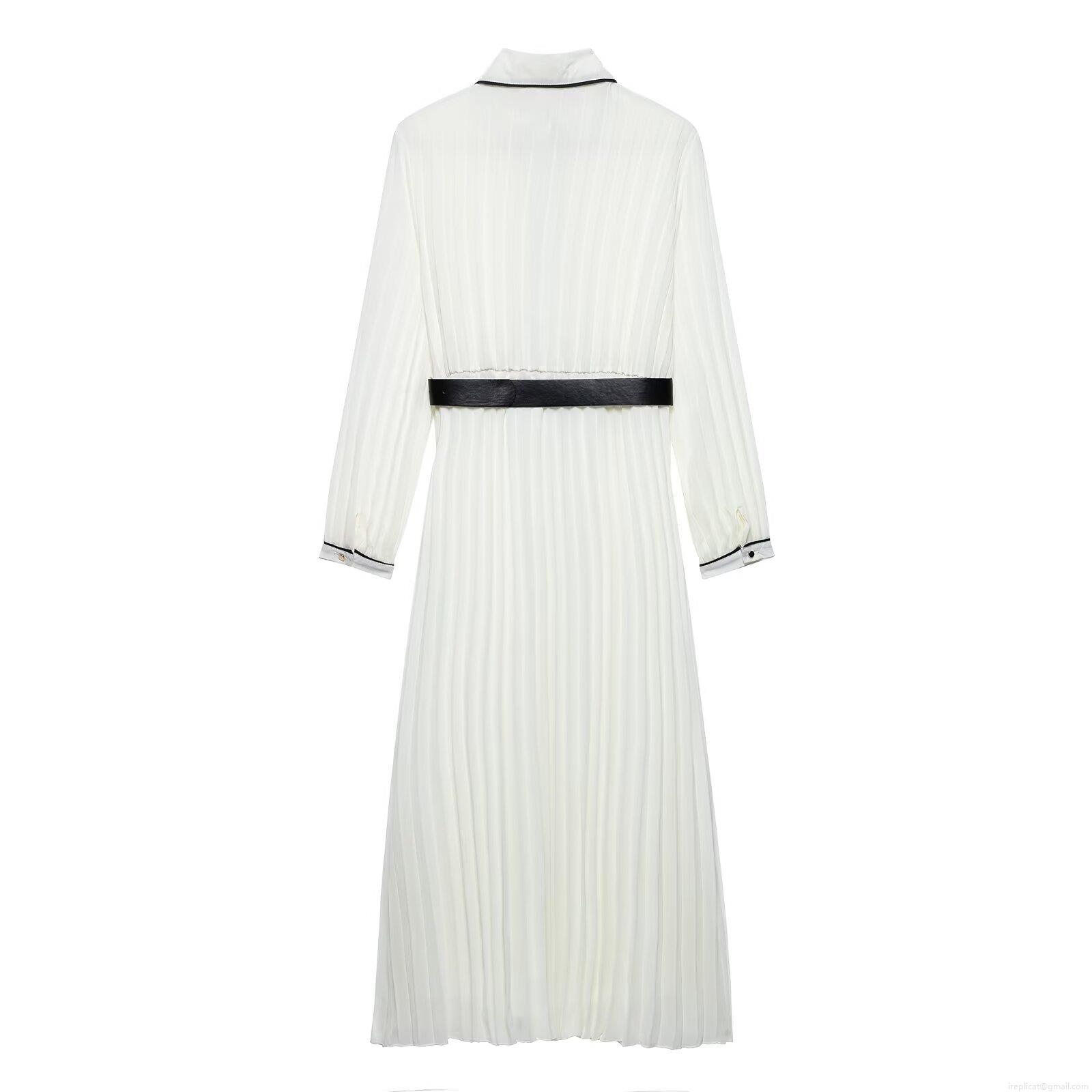Elegant White Pleated Maxi Dress For Women With Black Contrast Trim And Belt Long Sleeve Button Down Shirt Collar Chiffon Dress For Party Evening Office Daily Fashion