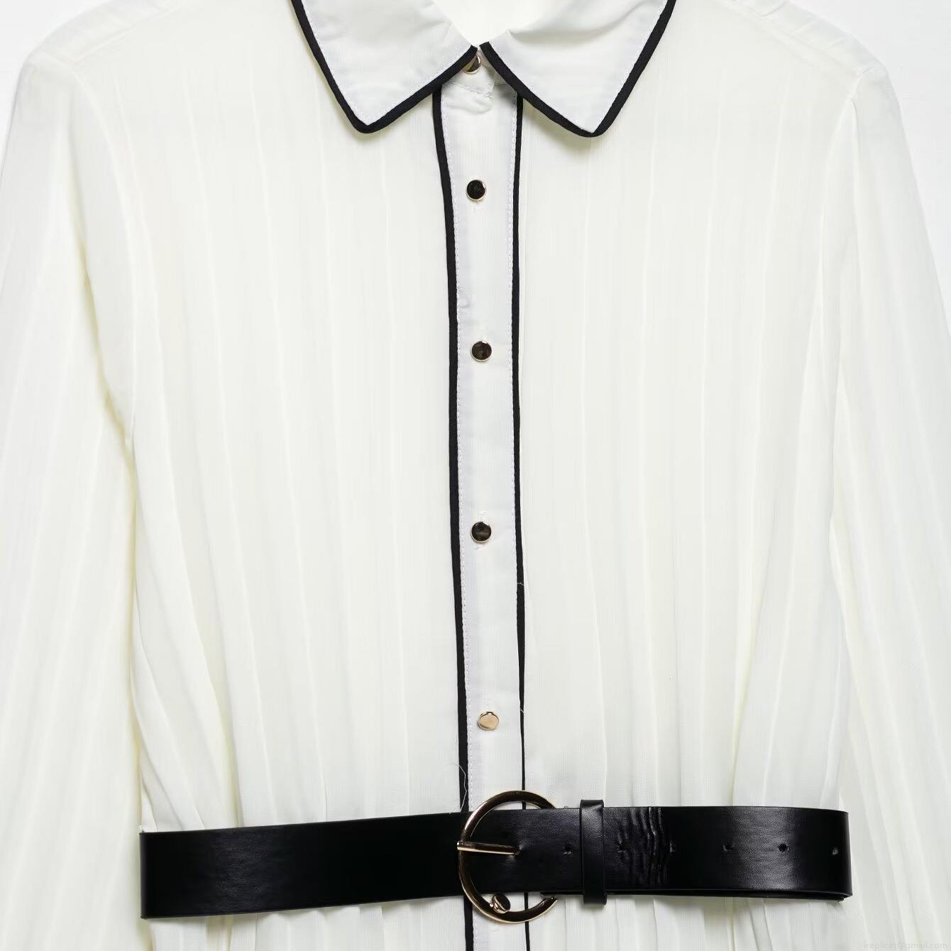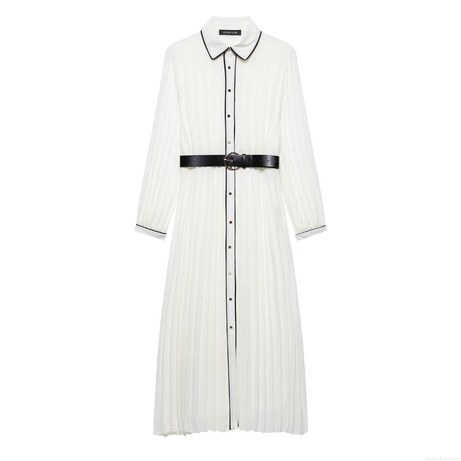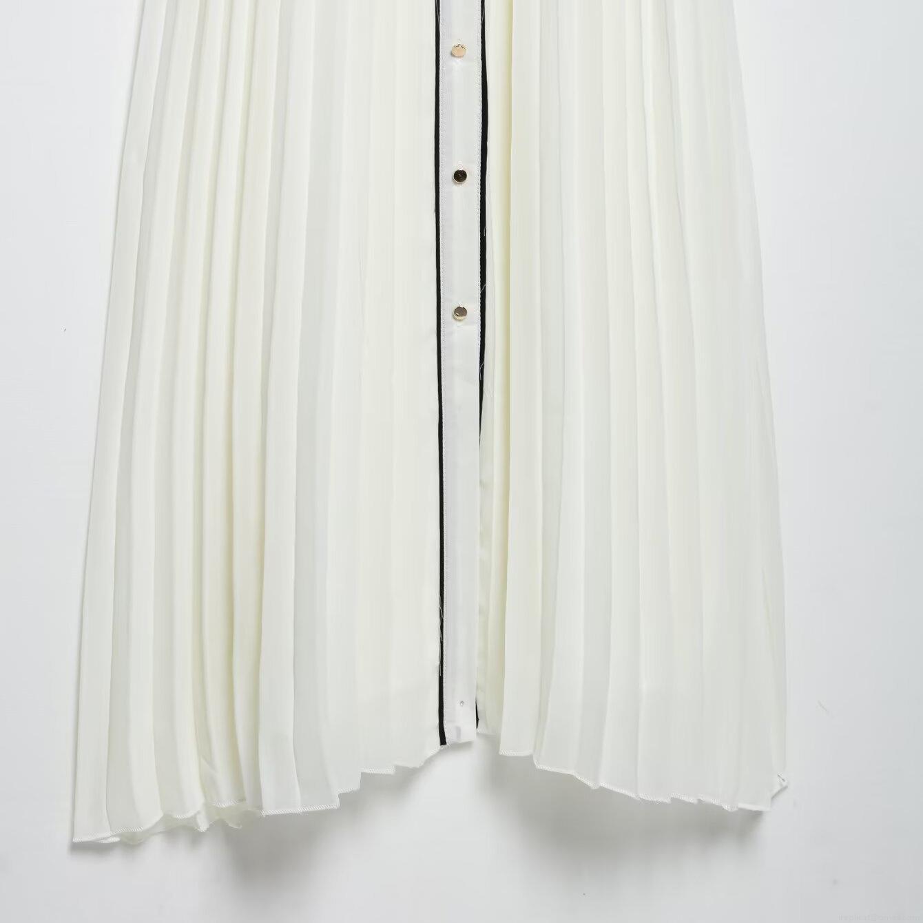 • Elegant White Pleated Maxi Dress For Women With Black Contrast Trim And Belt Long Sleeve Button Down Shirt Collar Chiffon Dress For Party Evening Office Daily Fashion