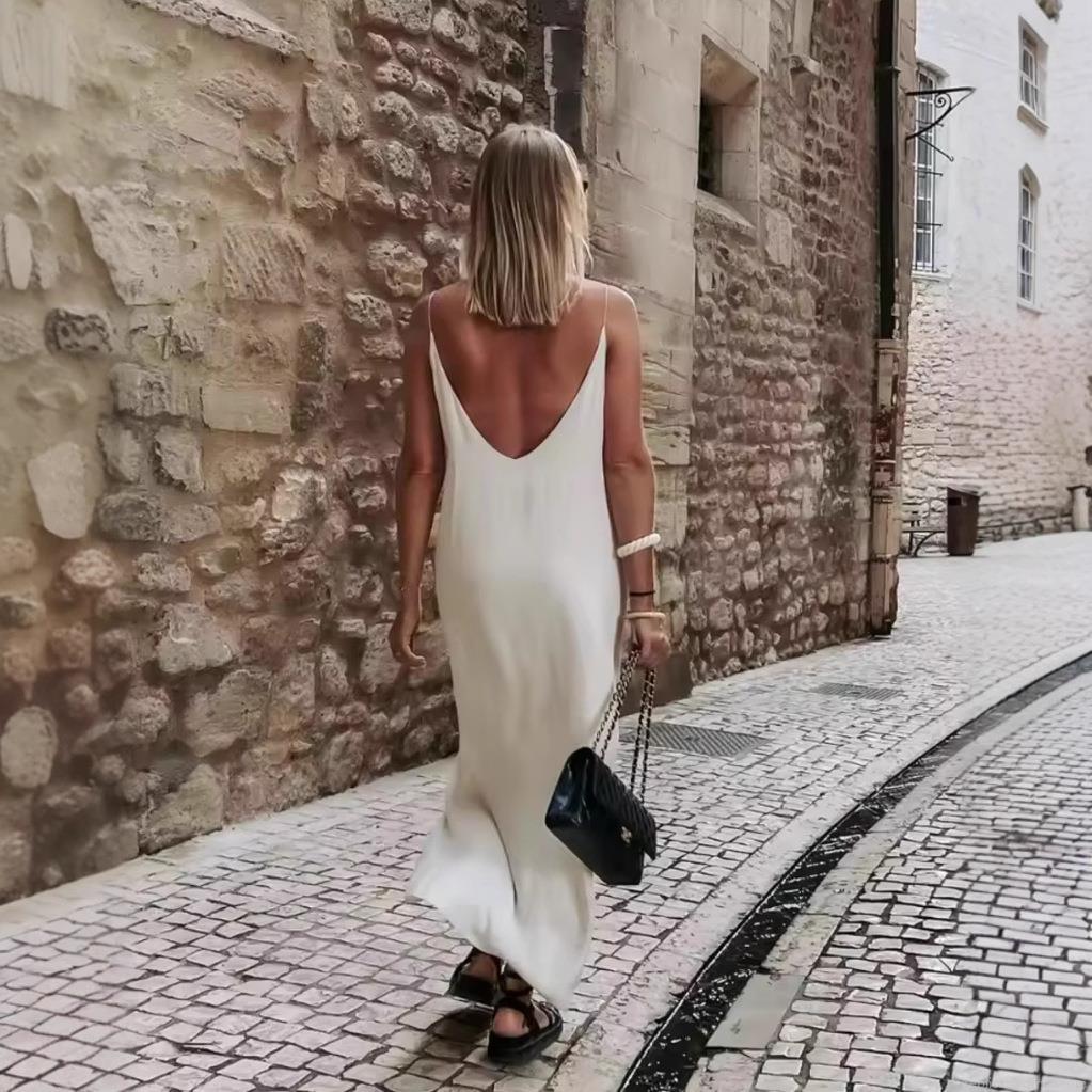 • Elegant White Satin Slip Maxi Dress For Women Sexy Backless Deep V-Neck High Slit Long Dress For Summer Resort Party Evening Clubwear