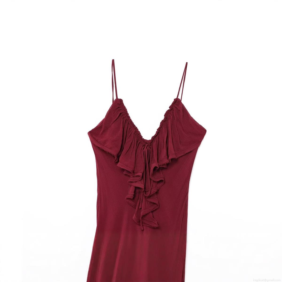 Elegant Wine Red Chiffon V-Neck Maxi Dress For Women Sexy Spaghetti Strap Ruffle Trim Pleated Evening Party Wedding Guest Long Dress
