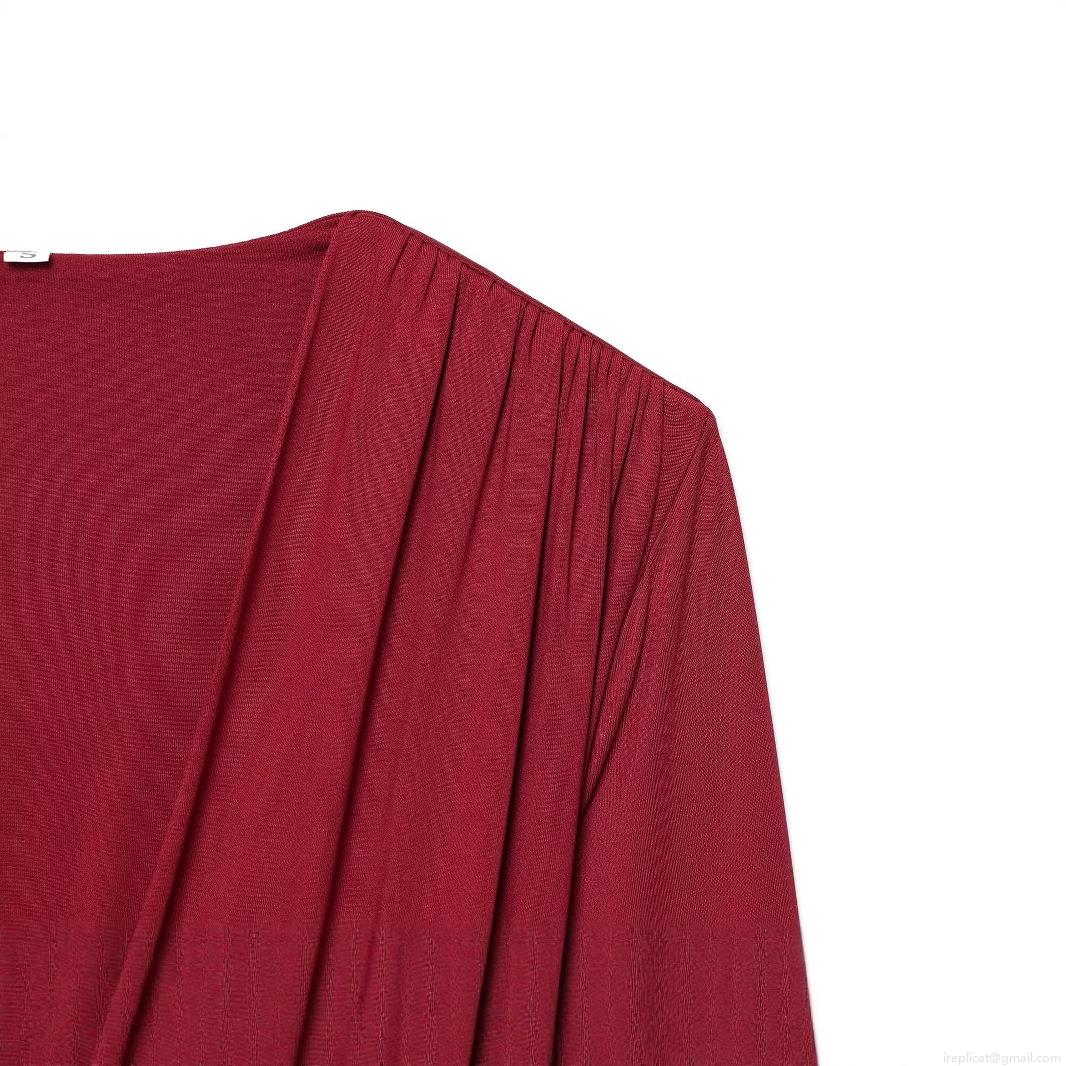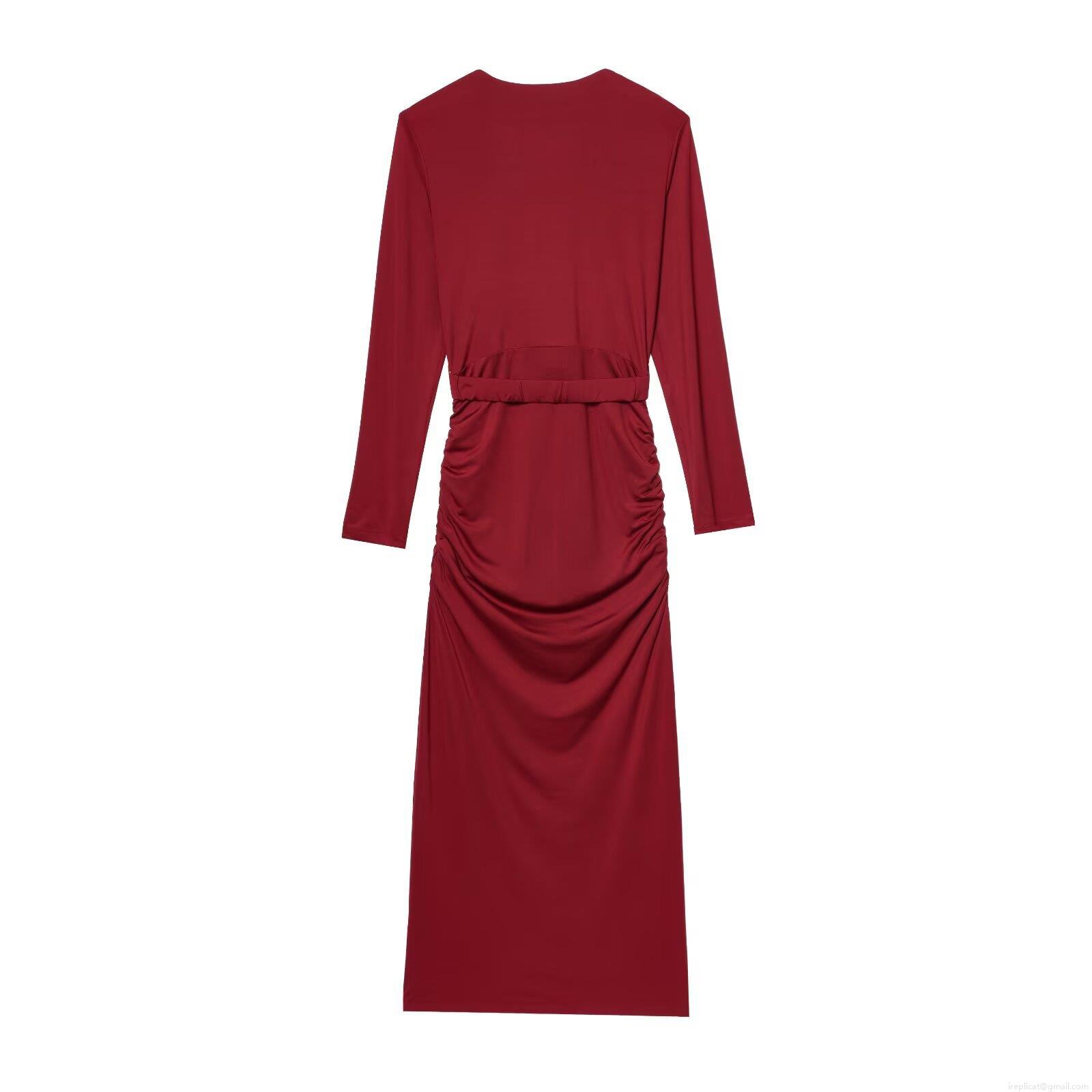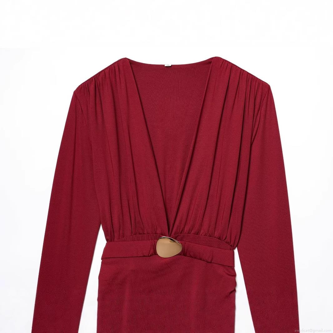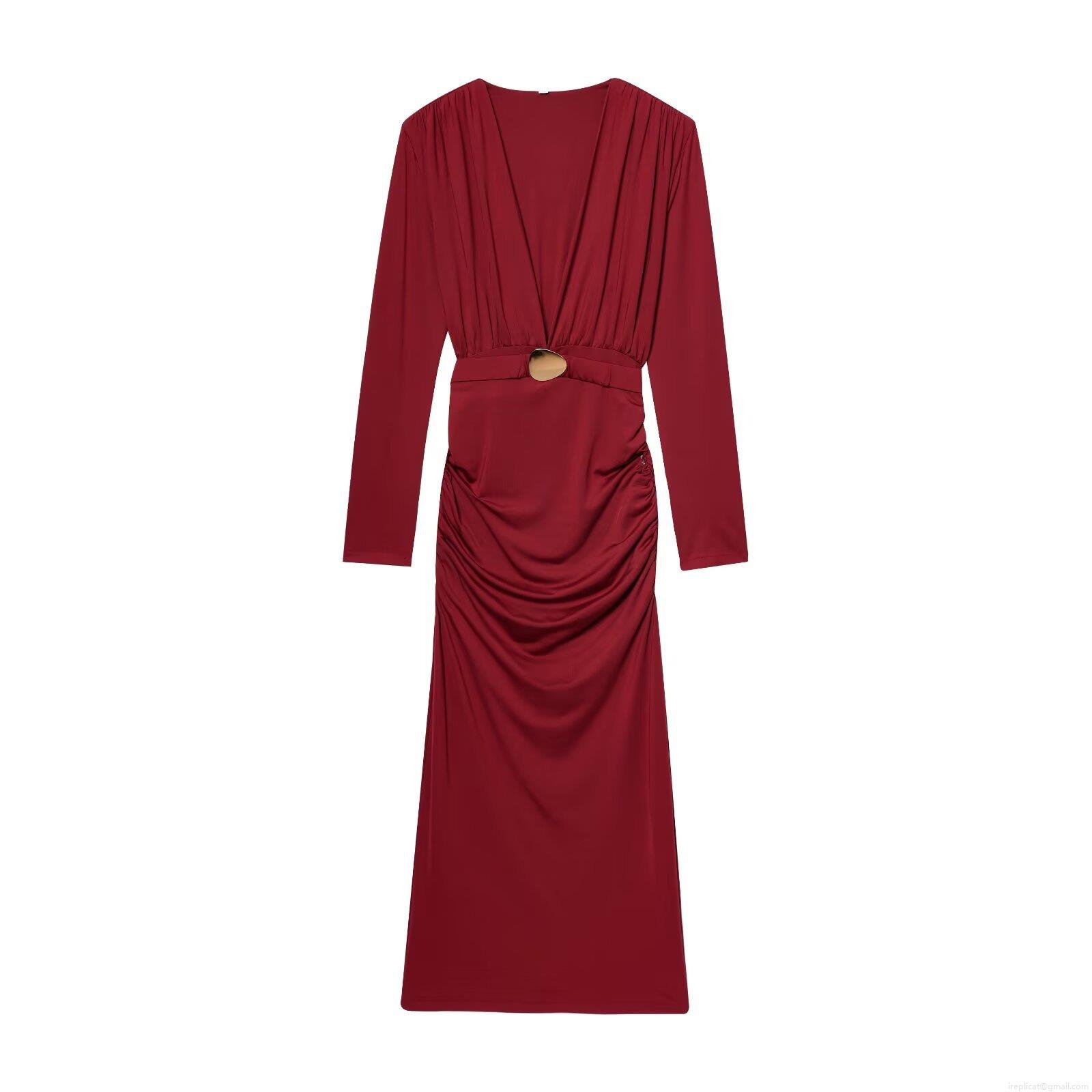 • Elegant Wine Red Deep V-Neck Maxi Dress For Women Sexy Ruched Long Sleeve Pleated Evening Party Long Dress With Gold Metal Waist Ornament