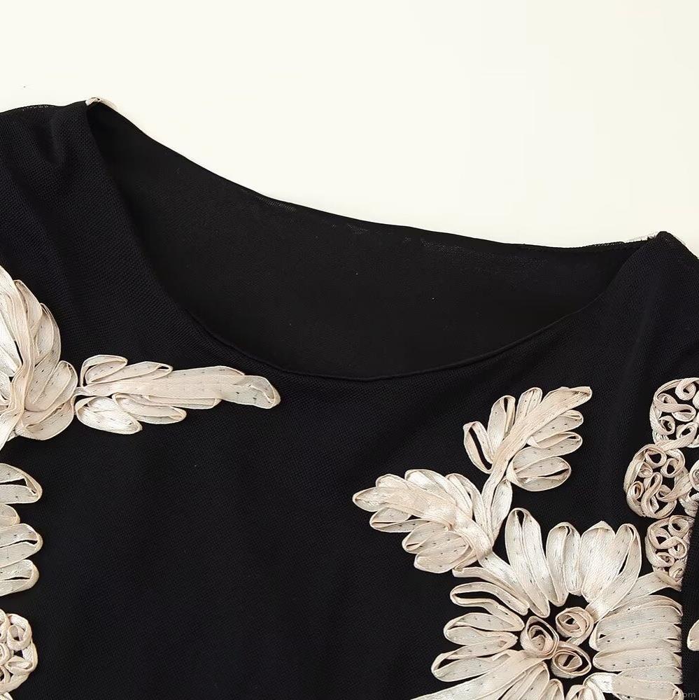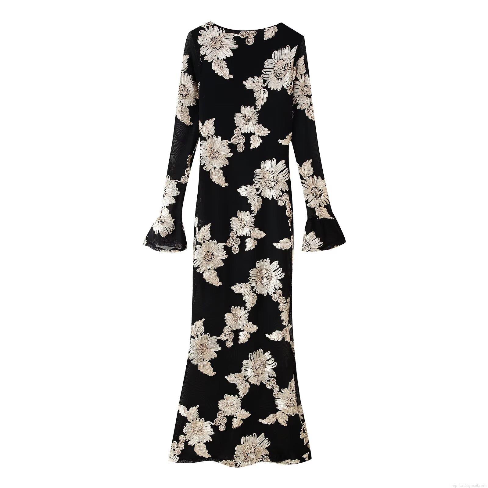 • Elegant Women 3D Floral Embroidery Mesh Dress Flare Long Sleeve Round Neck Slim Fit Bodycon Maxi Dress For Party Evening Wedding Socialite Style