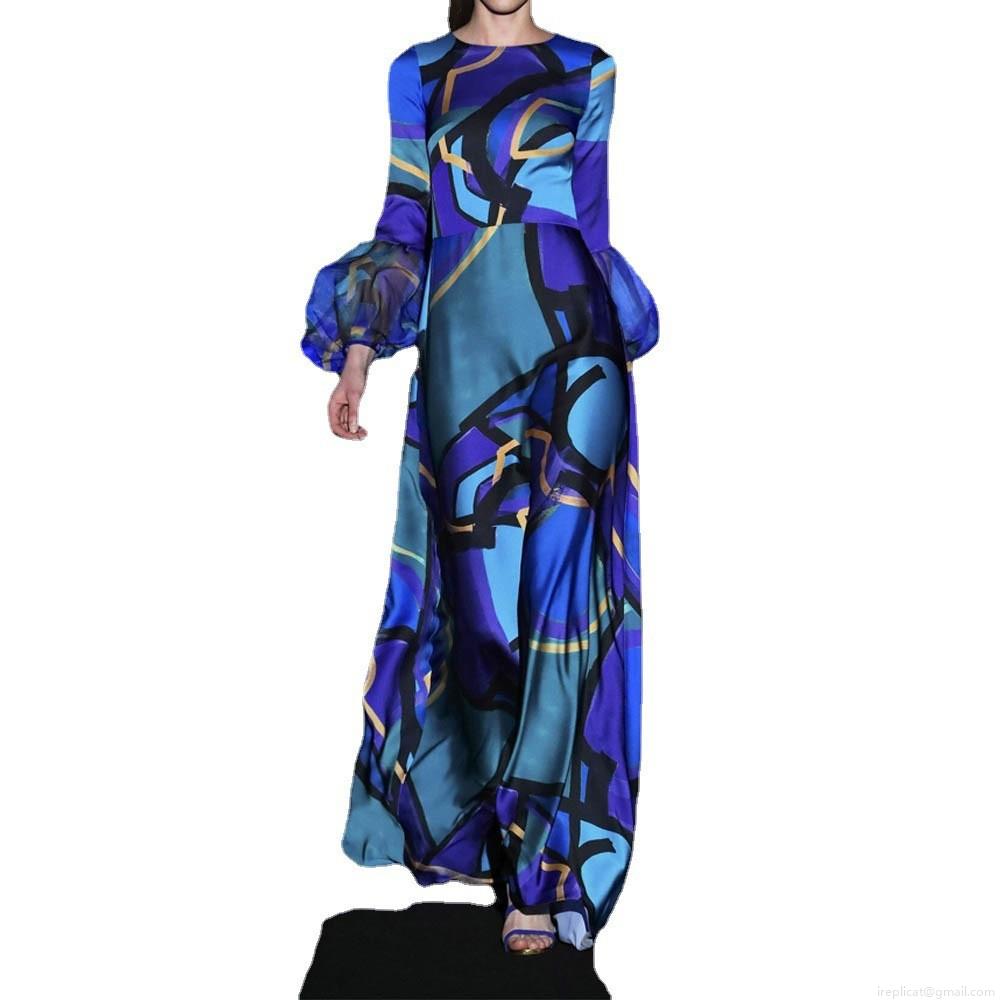 • Elegant Women Abstract Geometric Print Maxi Dress Satin Finish Long Lantern Sleeve Round Neck Retro Hepburn Style Commute Party Evening Long Gown