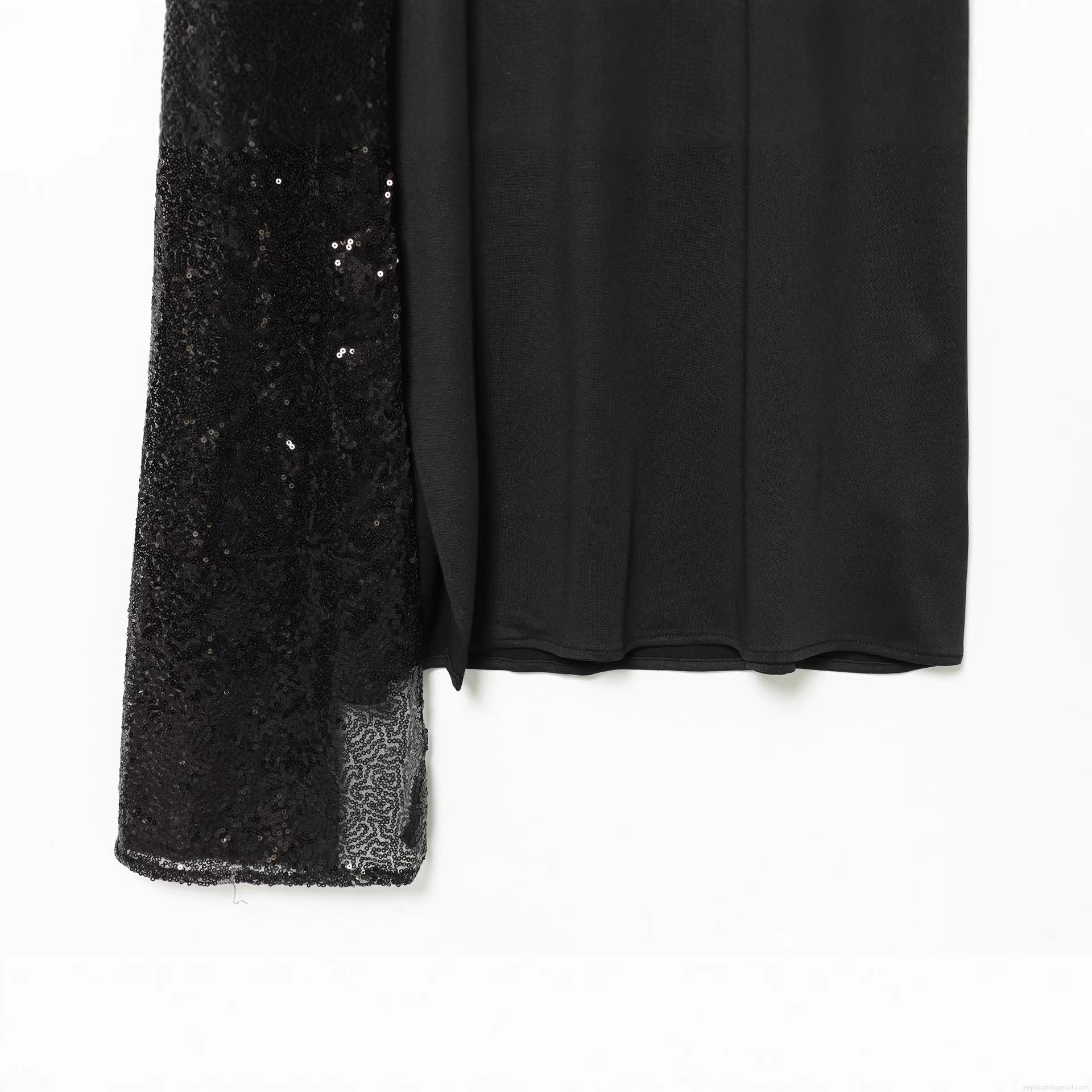 • Elegant Women Black Sequin Belt Maxi Dress Round Neck Bell Sleeve Solid Color Bodycon Midi Dress For Party Banquet Evening Socialite