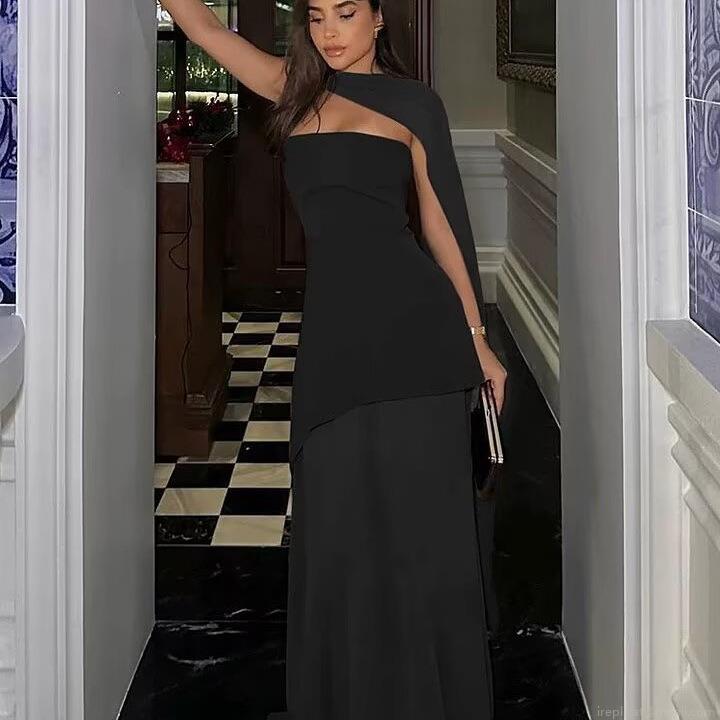 • Elegant Women Halter Bandeau Maxi Dress Sexy Polyester High Slit Irregular Hem Long Party Dress For Vacation Evening Wedding Guest Sexy Solid Color Sleeveless Splicing Scarf Neck Vestidos