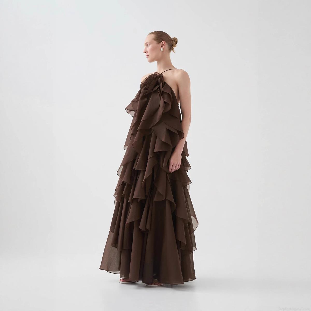 Elegant Women Halter Neck Ruffle Maxi Dress 3D Flower Decor Tiered Backless 100% Polyester Dress For Party Evening Wedding