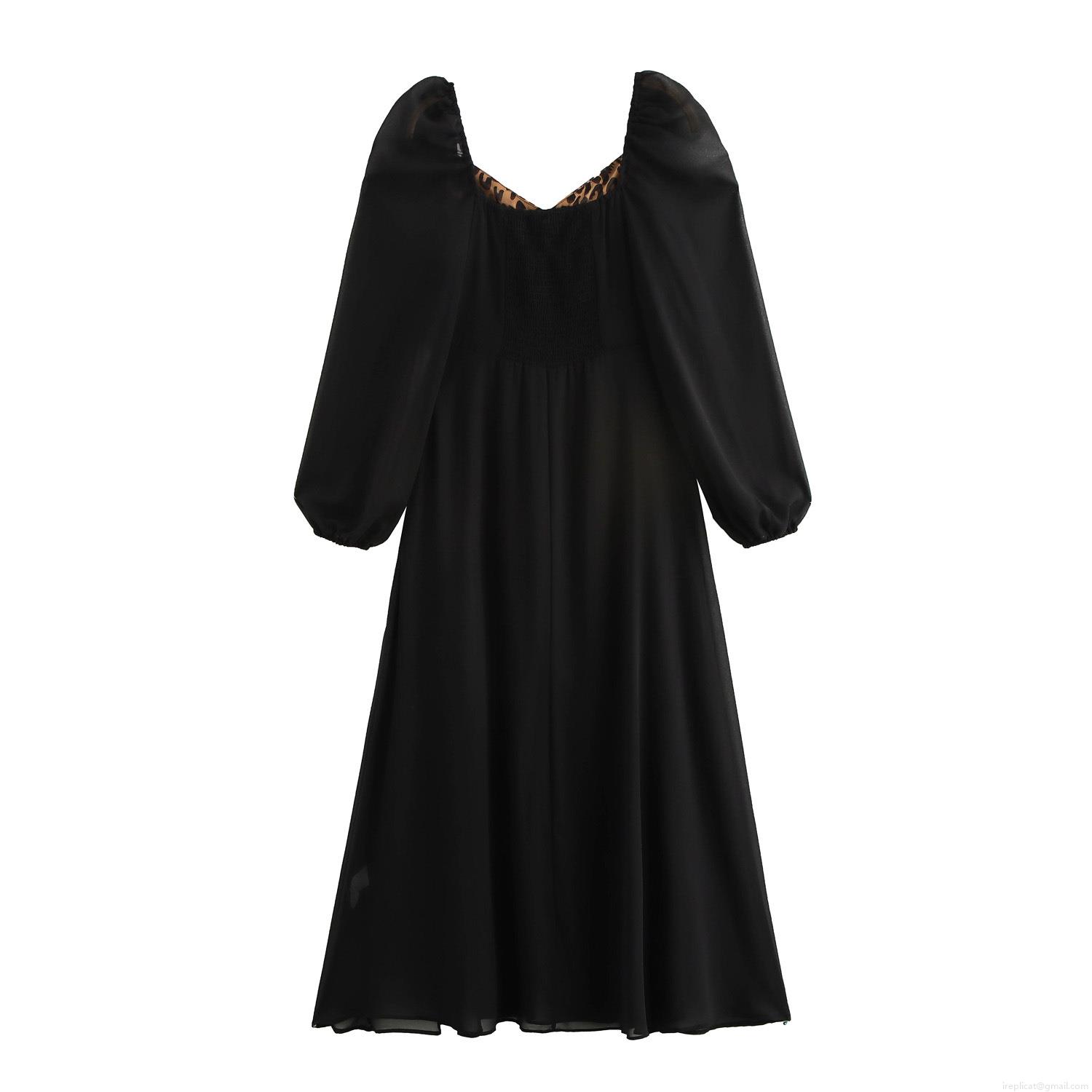 • Elegant Women Leopard Print Splicing Maxi Dress French Vintage Square Neck Long Sleeve Shirred Puff Sleeve Dress For Party Evening High Waist Pullover Slim Fit Long Skirt